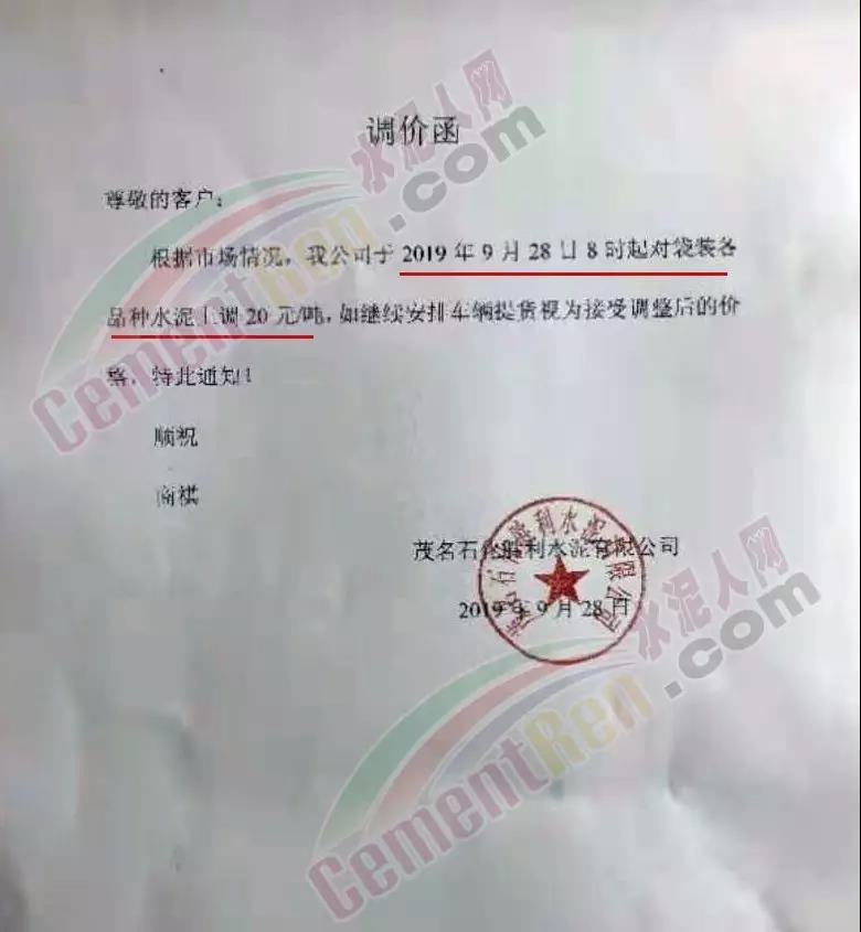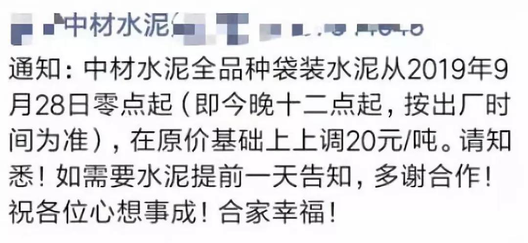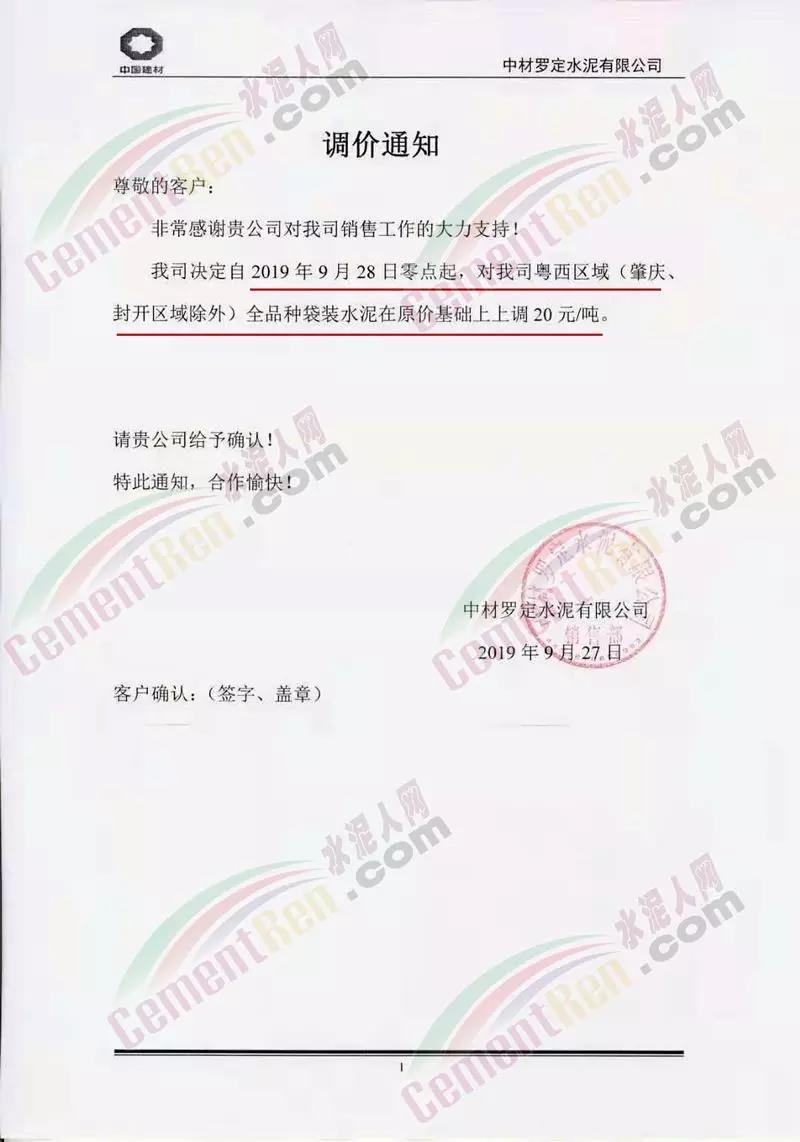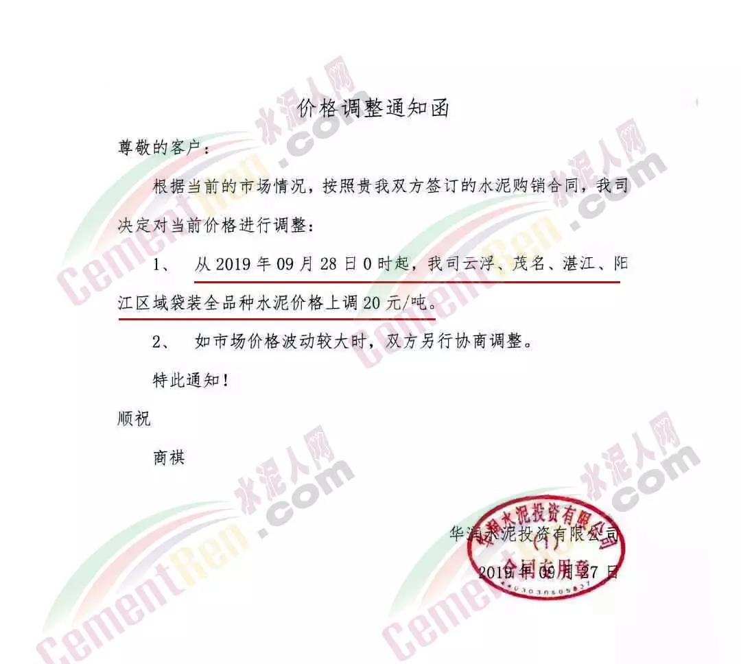 感谢您一直以来给予我司的大力支持!因市场行情变化,经研究决定,10月1日起,我公司销往贵处的水泥各品牌、各规格,袋、散装水泥全部上调20元/吨。