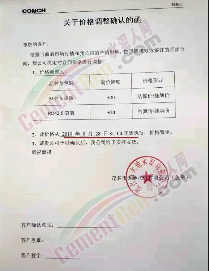 根据市场行情,弋阳海螺决定于2019年9月28日08:00时起,针对M32.5袋装、PO42.5袋装水泥价格上调20元/吨,PC42.5袋装水泥价格上调30元/吨,如您继续安排车辆到我公司提货,则视为您同意和确认本次价格调整。