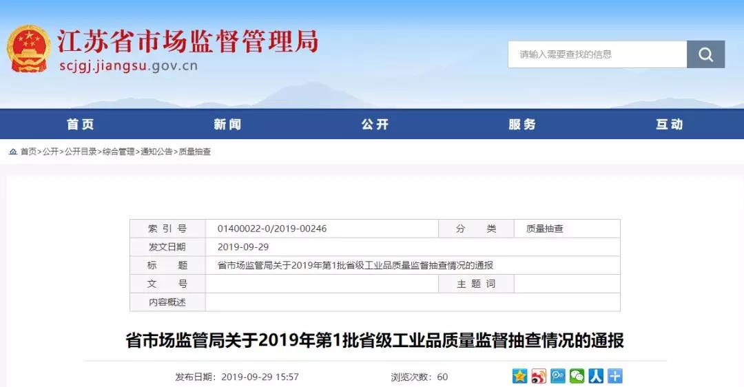 日前,江苏省市场监督管理局网站发布关于2019年第1批省级工业品质量监督抽查情况的通报。