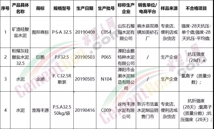 据通报,2019年第二季度,省市场监管局组织对建筑和装饰装修材料、农业生产资料、机械及安防产品等3大类29种产品质量进行了监督抽查。共抽查产品2733批次,合格2481批次,平均合格率为90.8%。其中,在江苏生产企业抽样1162批次,合格1068批次,合格率为91.9%;在市场实体店购样1317批次,合格1212批次,合格率为92%;在电商平台购样254批次,合格201批次,合格率为79.1%。建筑和装饰装修材料。抽查热轧带肋钢筋、冷轧带肋钢筋、水泥、建筑防水涂料、建筑用钢化玻璃、供水用塑料管材(PPR、PVC)、钢筋混凝土排水管、铝合金建筑型材、建筑保温材料9种产品726批次,合格631批次,合格率为86.9%。其中,抽查产品150批次,合格146批次,合格率为97.3%。抽查不合格项目为强度、氯离子含量2项指标,有3批次产品的强度、2批次产品的氯离子含量项目不合格。不合格样品的标称生产企业涉及山东石榴园水泥有限公司、溧阳金鹏特种水泥有限公司、溧阳市金濑水泥制造有限公司、徐州丰源水泥有限公司。水泥抽检不合格名单