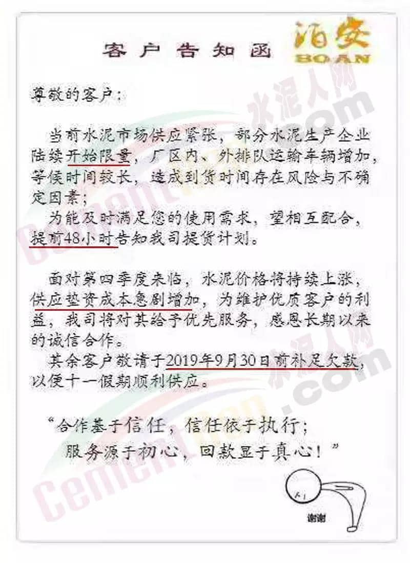 水泥人网通讯员消息:日前,泊安水泥发布客户告知函称,当前水泥市场供应紧张,部分水泥生产企业陆续开始限量,厂区内、外排队运输车辆增加,等候时间较长,造成到货时间存在风险与不确定因素;为能及时满足客户使用需求,须提前48小时告知提货计划。面对第四季度来临,水泥价格将持续上涨,供应垫资成本急需增加,为维护优质客户的利益,公司将对其给予优先服务,其余客户须于9月30日前补足欠款,以便十一假期顺利供应。