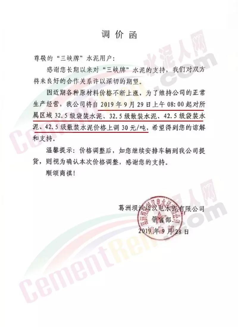 根据当前市场形势及产销存情况,我公司定于2019年9月30日8:00对袋装和散装所有品种水泥价格上调20元/吨。顺祝商祺!温馨提示:价格调整后,如继续安排车辆到我司提货,视为确认此次价格调整!感谢您的信任与支持!