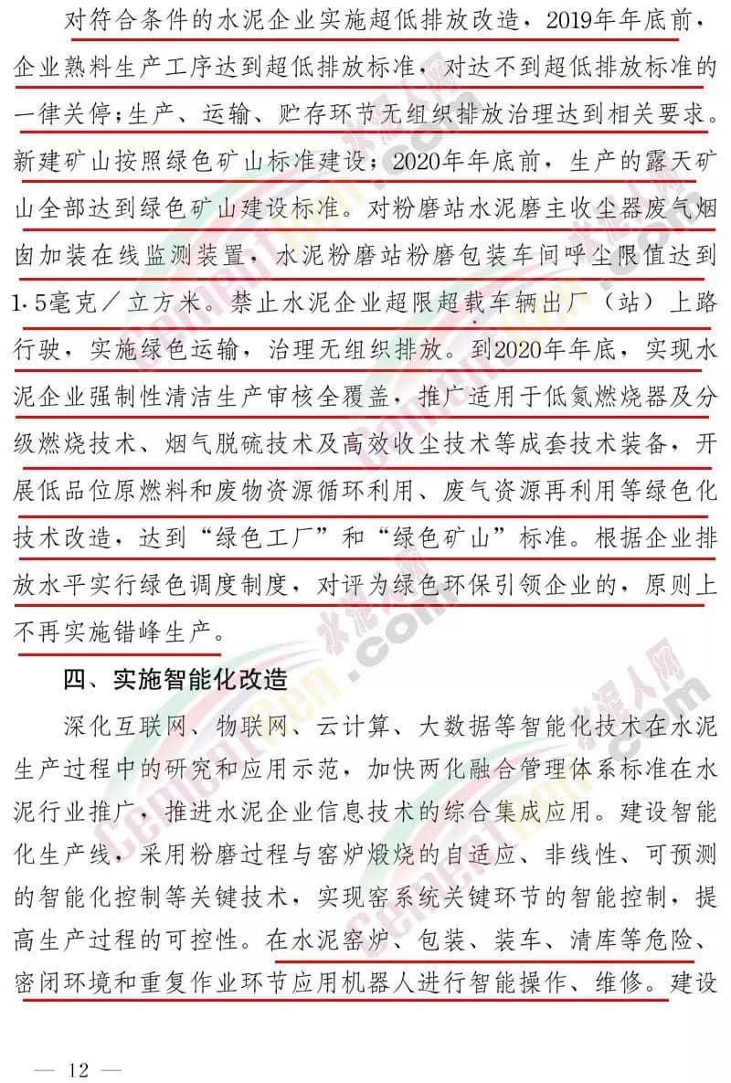 2.对符合条件的水泥企业实施超低排放改造,2019年底前,企业熟料生产工序达到超低排放标准,对达不到超低排放标准的一律关停;生产、运输、贮存环节无组织排放治理达到相关要求。