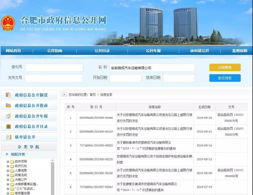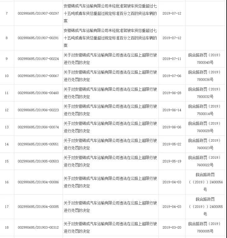 据安徽省合肥市政府信息公开网信息显示,近两个月来涉事企业安徽锦成汽车运输有限公司被处罚多次。自8月9日以来,上述企业的运砂车已经连续三次因超限被罚,罚款合计九万元,超限率分别为63.67%、70.91%、193.02%。