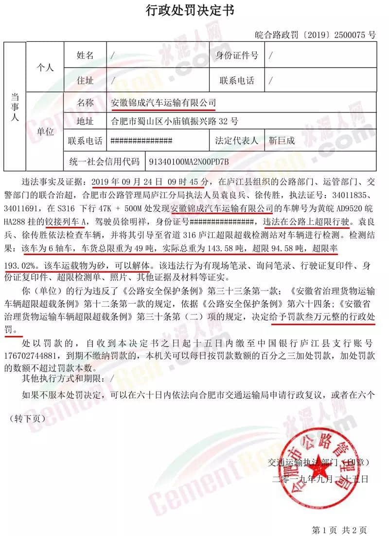 9月26日生效的《关于对安徽锦成汽车运输有限公司违法在公路上超限行驶进行处罚的决定》(皖合路政罚〔2019〕2500075号)提到2019年09月24日09时45分,在庐江县组织的公路部门、运管部门、交警部门的联合治超,合肥市公路管理局庐江分局执法人员发现安徽锦成汽车运输有限公司的车牌号为黄皖AD9520皖HA288挂的铰接列车A,违法在公路上超限行驶。执法人员依法检查车辆,并将其引导至省道316庐江超限超载检测站对车辆进行检测。检测结果:该车为6轴车,车货总限重为49吨,实际总重为143.58吨,超限94.58吨,超限率193.02%。该车运载物为砂,可以解体。上述行为违反了《公路安全保护条例》第三十三条第一款;《安徽省治理货物运输车辆超限超载条例》第十二条第一款的规定,依据《公路安全保护条例》第六十四条;《安徽省治理货物运输车辆超限超载条例》第三十条第(二)项的规定,决定给予相关企业罚款叁万元整的行政处罚。