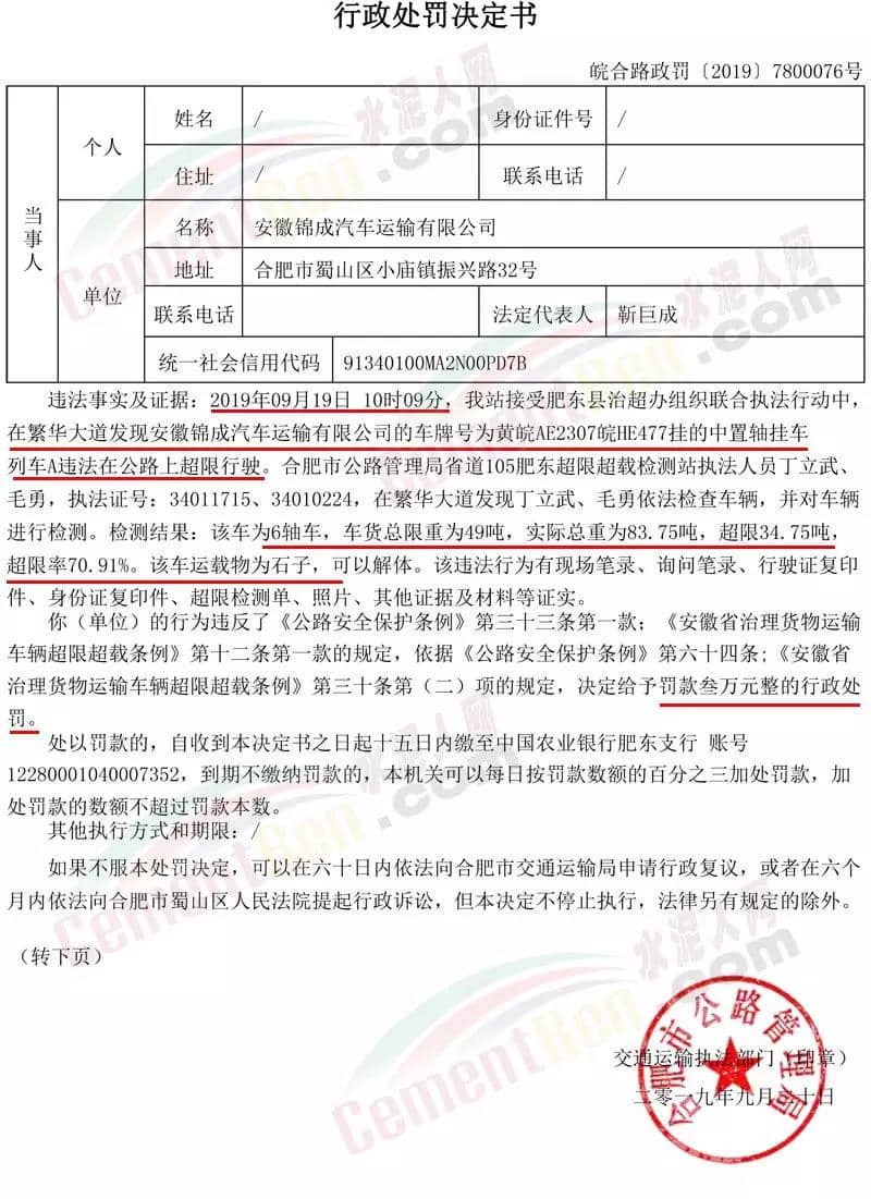 9月24日生效的《关于对安徽锦成汽车运输有限公司违法在公路上超限行驶进行处罚的决定》(皖合路政罚〔2019〕7800076号)中违法事实及证据提到2019年09月19日10时09分,我站接受肥东县治超办组织联合执法行动中,在繁华大道发现安徽锦成汽车运输有限公司的车牌号为黄皖AE2307皖HE477挂的中置轴挂车列车A违法在公路上超限行驶。合肥市公路管理局省道105肥东超限超载检测站执法人员依法检查车辆,并对车辆进行检测。检测结果:该车为6轴车,车货总限重为49吨,实际总重为83.75吨,超限34.75吨,超限率70.91%。该车运载物为石子,可以解体。上述行为违反了《公路安全保护条例》第三十三条第一款;《安徽省治理货物运输车辆超限超载条例》第十二条第一款的规定,依据《公路安全保护条例》第六十四条;《安徽省治理货物运输车辆超限超载条例》第三十条第(二)项的规定,决定给予罚款叁万元整的行政处罚。