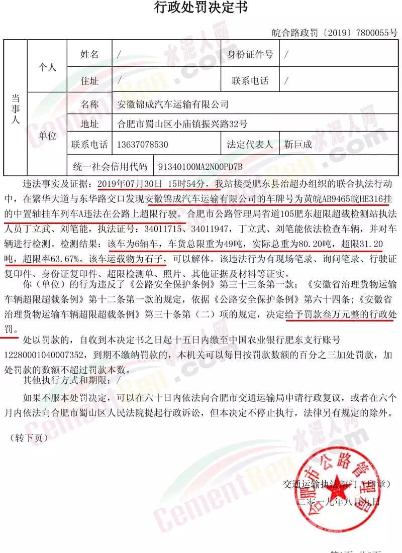 8月9日生效的《关于对安徽锦成汽车运输有限公司违法在公路上超限行驶进行处罚的决定》(皖合路政罚〔2019〕7800055号)文件中提到2019年07月30日15时54分,我站接受肥东县治超办组织的联合执法行动中,在繁华大道与东华路交口发现安徽锦成汽车运输有限公司的车牌号为黄皖AB9465皖HE316挂的中置轴挂车列车A违法在公路上超限行驶。合肥市公路管理局省道105肥东超限超载检测站执法人员丁立武、刘笔能,执法证号:34011715、34011947,丁立武、刘笔能依法检查车辆,并对车辆进行检测。检测结果:该车为6轴车,车货总限重为49吨,实际总重为80.20吨,超限31.20吨,超限率63.67%。该车运载物为石子,可以解体。 上述企业的行为违反了《公路安全保护条例》第三十三条第一款;《安徽省治理货物运输车辆超限超载条例》第十二条第一款的规定,依据《公路安全保护条例》第六十四条;《安徽省治理货物运输车辆超限超载条例》第三十条第(二)项的规定,决定给予罚款叁万元整的行政处罚。