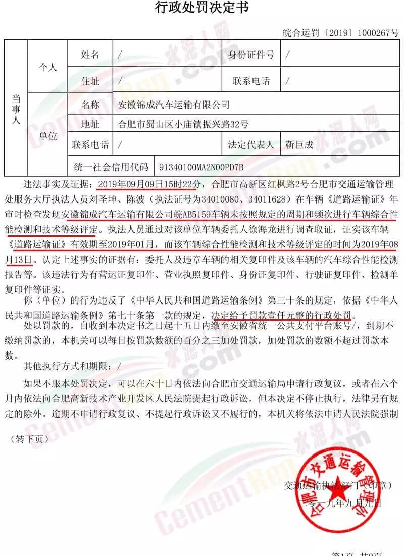 合肥市政府信息公开网9月12日公开信息《安徽锦成汽车运输有限公司不按规定维护和检测运输车辆的案》提到:2019年09月09日15时22分,合肥市高新区红枫路2号合肥市交通运输管理处服务大厅执法人员刘圣坤、陈波(执法证号为34010080、34011628)在车辆《道路运输证》年审时检查发现安徽锦成汽车运输有限公司皖AB5159车辆未按照规定的周期和频次进行车辆综合性能检测和技术等级评定。执法人员通过对该单位车辆委托人徐海龙进行调查取证,证实该车辆《道路运输证》有效期至2019年01月,而该车辆综合性能检测和技术等级评定的时间为2019年08月13日。因上述单位的行为违反了《中华人民共和国道路运输条例》第三十条的规定,依据《中华人民共和国道路运输条例》第七十条第一款的规定,决定给予罚款壹仟元整的行政处罚。