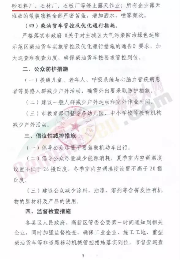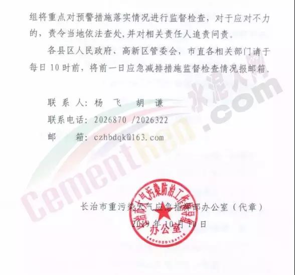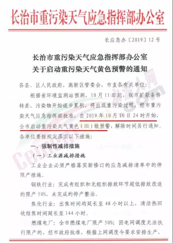日前,长治市重污染天气应急指挥部办公室发布启动重污染天气黄色预警的通知,要求自10月10日24时起,全市启动 重污染天气黄色预警。要求辖区内水泥行业停产、采石采砂行业停产、国四以下车辆禁运、矿山、砂石料厂等停止作业。通知原文如下: