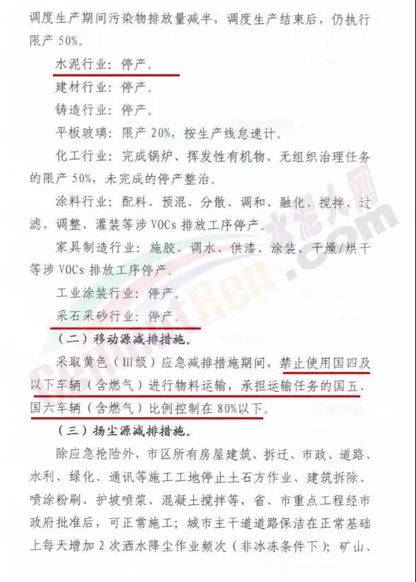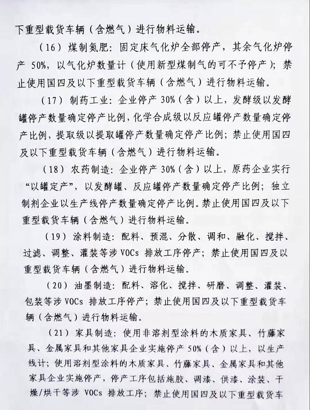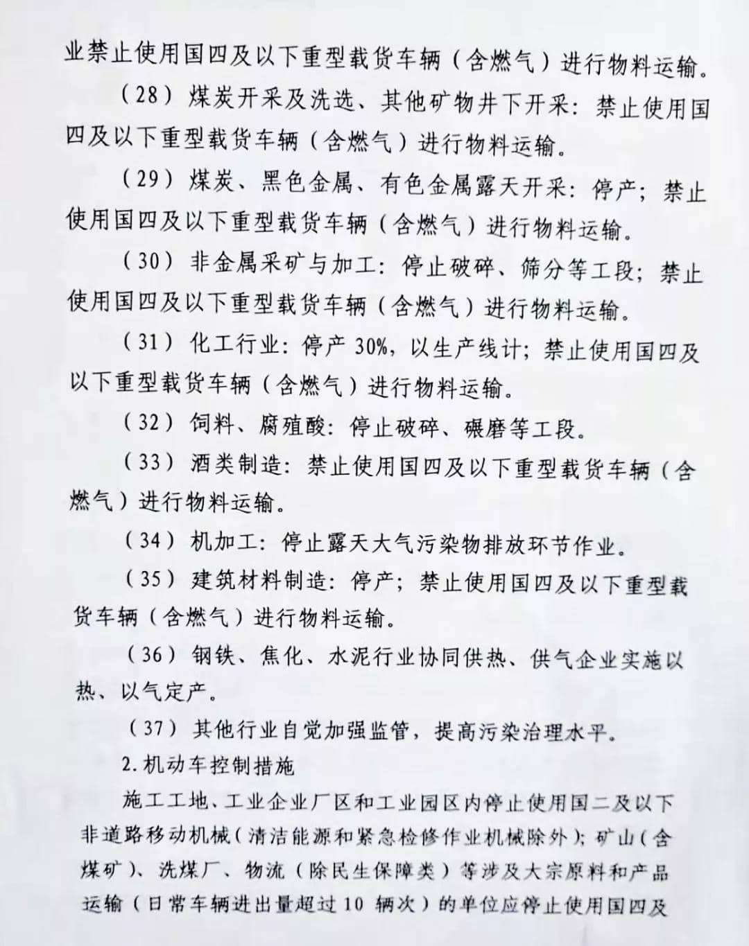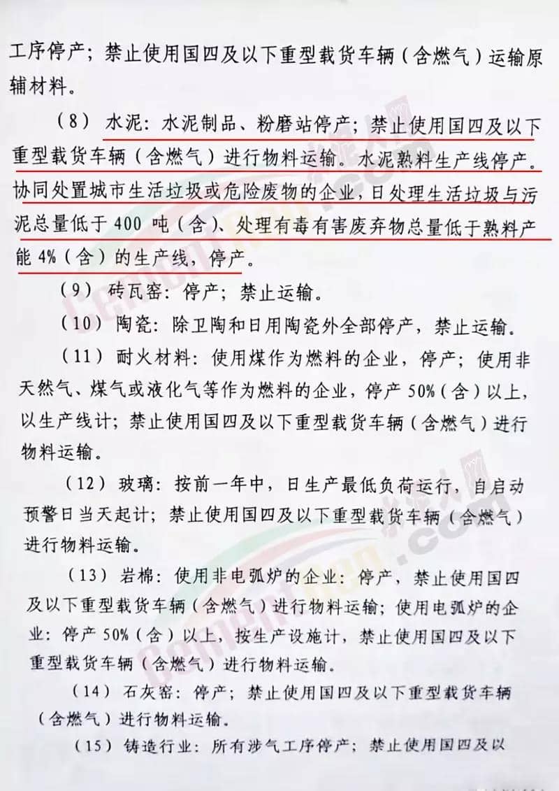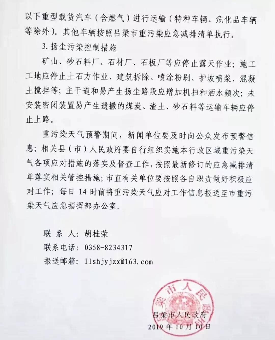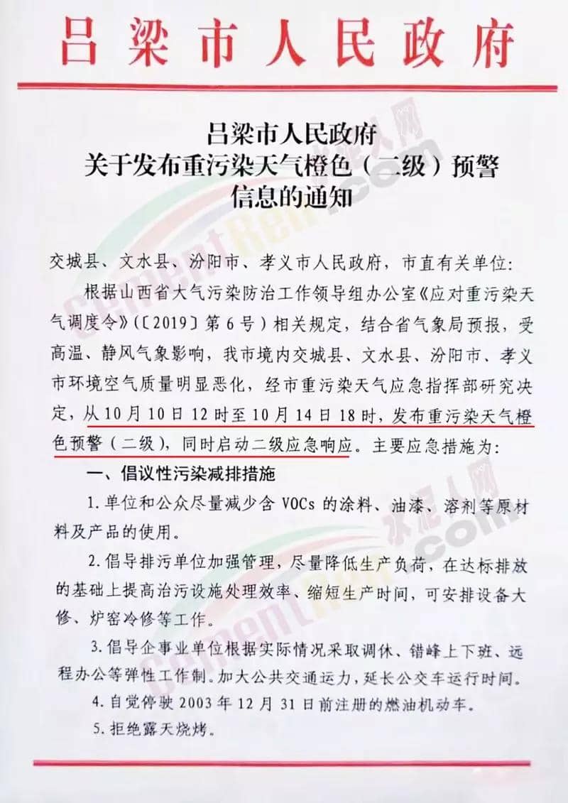 同期,吕梁市人民政策亦发布了重污染天气橙色预警通知。通知称自10月10日12时对10月14日18时,发布重污染天气橙色预警,同时启动二级应急响应。工业企业强制减排措施要求水泥:水泥制品、粉磨站停产;禁止使用国四及以下重型载货车辆进行物料运输。水泥熟料生产线停产,协同处置城市 生活垃圾或危废的企业,日处理生活垃圾与污泥总量低于400吨、处理危废总量低于熟料产能4%的生产线停产。通知全文如下: