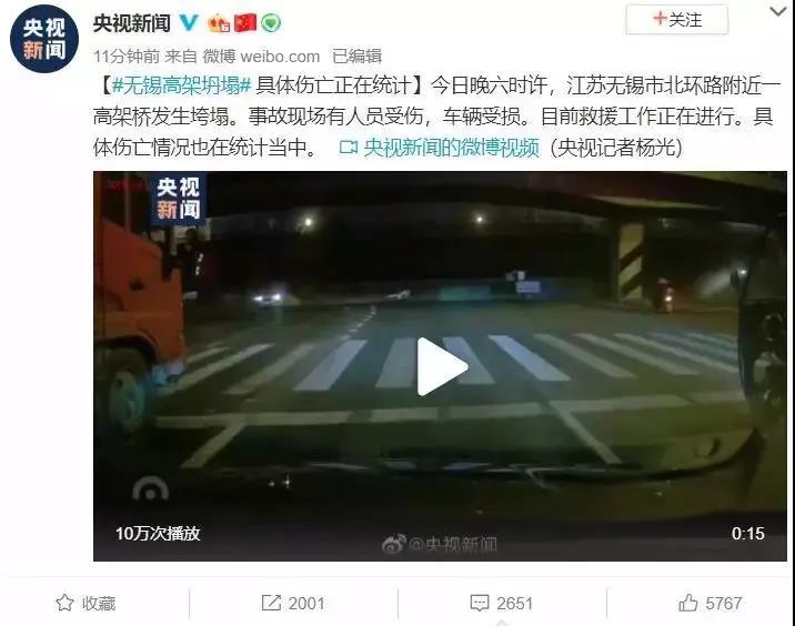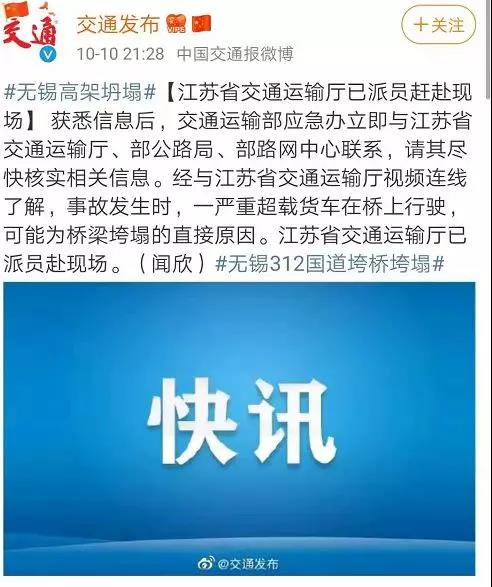 图片来源:新浪微博@无锡交通广播晚上8时许,央视新闻称,目前,救援车辆已到现场。交警在距离事故现场不到2公里处的华庄岸大桥进行封路。提醒大家绕行!