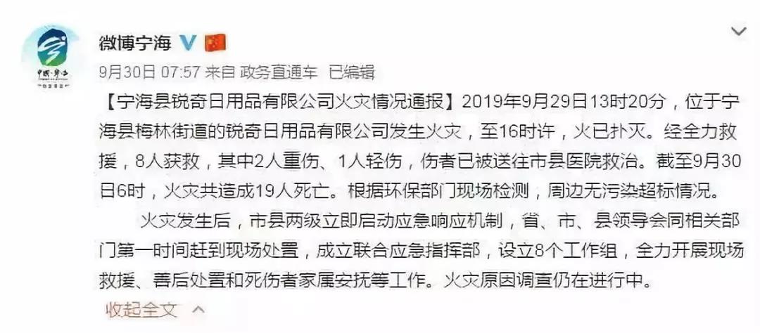 9月30日7时57分,宁海县委相关部门发布通告,称在此次火灾中,经全力救援,8人获救,其中2人重伤、1人轻伤,伤者已被送往市县医院救治。截至9月30日6时,火灾共造成19人死亡。