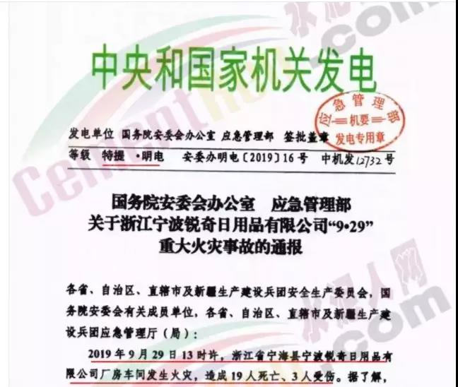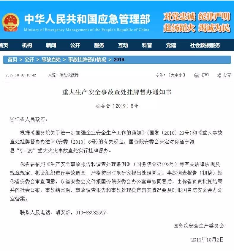 10月8日国家应急管理部官网发布来自于消防救援局的《重大生产安全事故查处挂牌督办通知书》(安委督﹝2019﹞8号)提到根据《国务院关于进一步加强企业安全生产工作的通知》(国发﹝2010﹞23号)和《重大事故查处挂牌督办办法》(安委﹝2010﹞6号)的有关规定,国务院安委会决定对浙江省宁波市宁海县“9·29”重大火灾事故查处实行挂牌督办。通知要求浙江省依照《生产安全事故报告和调查处理条例》(国务院令第493号)等有关法律法规及规章规定,抓紧组织进行事故调查,严格按照时限研究提出处理意见。