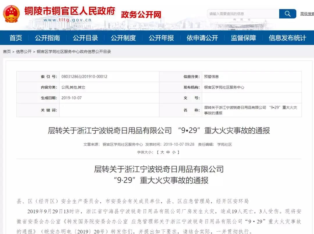 事故发生后,各级机关非常重视。10月3日,国务院安委会办公室、应急管理部下发了《关于浙江宁波锐奇日用品有限公司“9•29”重大火灾事故的通报》的特提文件。文件指出,初步调查表明,火灾系车间工作人员在一层香水灌装区域生产过程中操作不当引发塑料制品、包装纸以及三甘酯、异构十二烷、香精等原料燃烧。并要求各地立即开展小企业、小加工作坊等场所安全生产专项检查。
