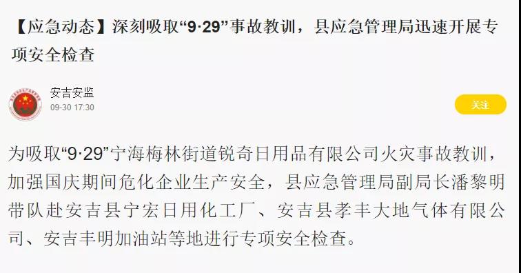 事故发生后,浙江省湖州市安吉县应急管理局深刻吸取“9.29”事故教训,迅速开展了专项安全检查。由县应急管理局副局长亲自带队赶区域内相关企业进行专项安全检查。
