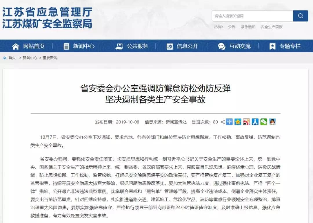 10月7日10月7日,江苏省安委会办公室下发通知,要求各地、各有关部门和单位坚决防止思想懈怠、工作松劲、事故反弹,防范遏制各类生产安全事故。