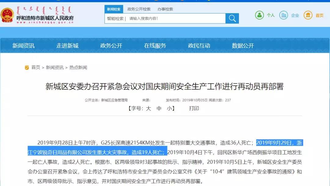 10月5日内蒙古呼和浩特市新城区人民政府转发新城区应急管理部消息称,2019年9月28日上午7时许,G25长深高速2154KM处发生一起特别重大交通事故,造成36人死亡;2019年9月29日,浙江宁波锐奇日用品有限公司发生重大火灾事故,造成19人死亡;2019年10月4日下午,回民区新华广场西侧振华项目工地发生一起亡人事故,造成2人死亡。根据市、区两级领导对3起事故的批示、指示精神,2019年10月5日上午,新城区安全生产委员会办公室召开紧急会议,会上传达了呼和浩特市安全生产委员会办公室文件《关于“10·4”建筑领域生产安全事故的通报》和市、区两级领导批示、指示意见,并对十一期间安全生产工作进行再动员再部署。