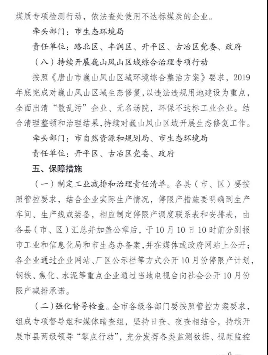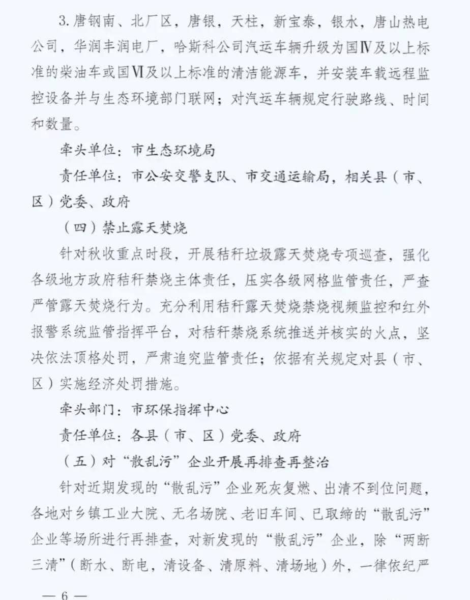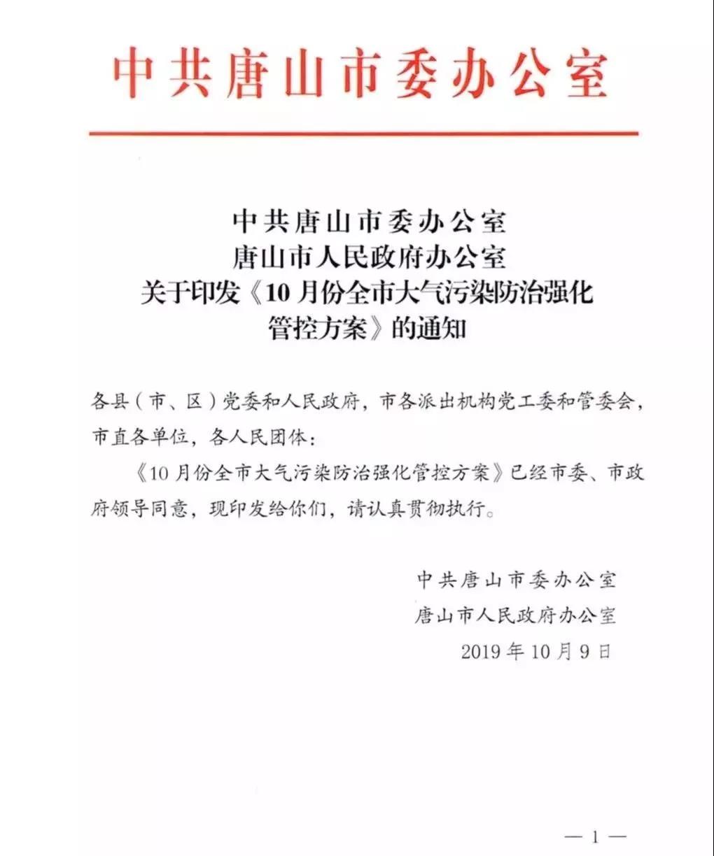 日前,中共唐山市委办公室 唐山市人民政府办公室下发《关于印发《10月份全市大气污染防治强化管控方案》的通知。
