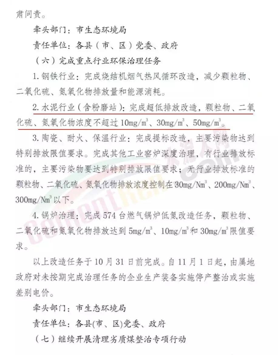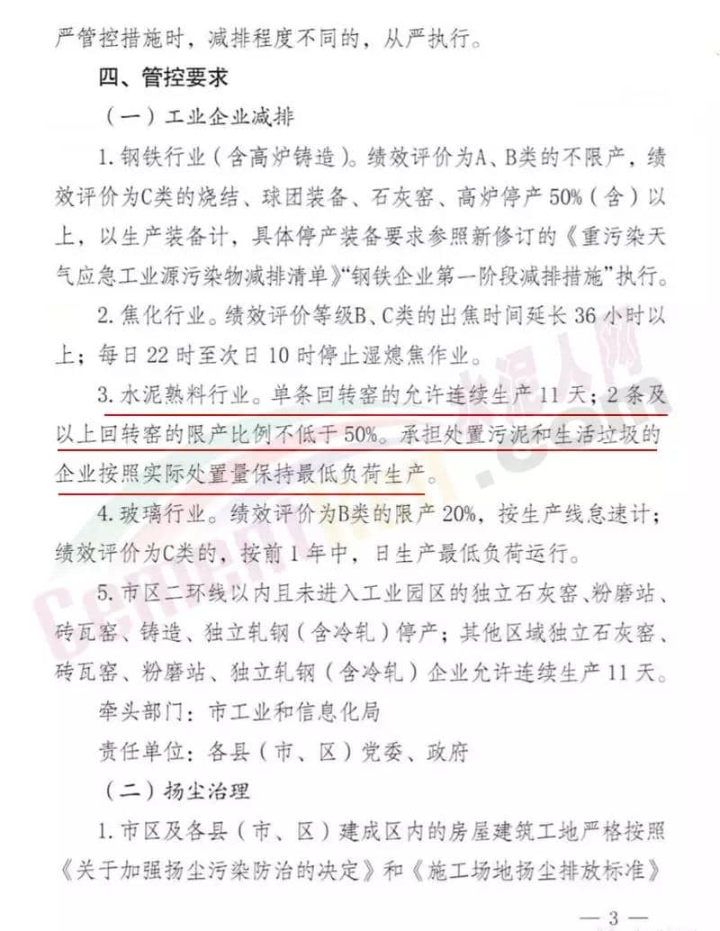 10月份唐山市全市大气污染防治强化管控方案中提到管理时限为10月10日0时至10月31日24时。管控期间要求水泥熟料行业。单条回转窑的允许连续生产11天;2条及以上回转窑的限产比例低于50%。承担处理污泥和生活垃圾的企业按照实际处置量保持最低负荷生产。水泥行业(含粉磨站):完成超低排放改造,颗粒物、二氧化硫、氮氧化物浓度不超过10mg/m3、30mg/m3、50mg/m3。