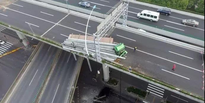 上海中环线高架内圈沪嘉立交出口至沪太路上匝道之间发生一起货车单车事故,导致车上装载的水泥管桩散落,部分管桩翻落至地面道路,事故造成中环高架主线桥体内侧翘起移位。