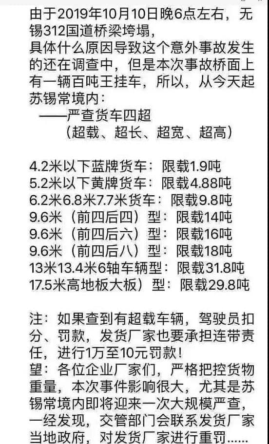 另外一个原因是由于市场竞争因素,现有的重载货车如果不超载很难盈利。这在如今去产能、制造业竞争压力大的情况下,想提高货运行业的收入杜绝超载现象是非常难的。对于超载货车罚款后继续放行,也给桥梁造成了很大的安全隐患。另外一个,大家很感兴趣的是这次事故和台湾近期事故的对比。专家认为,无论是从桥的重要性,还是从暴露问题的严重程度,两者都是不可相提并论的。无锡这次垮塌的桥是一座跨度二十多米的高架简支梁桥,台湾是一座140多米的拱桥。前者是一个很普通的工程,相当于一座普通的三层洋房,后者则是一个地区的重点标志工程,肯定是进行了详细的安全性研究和重点的审查,无锡事故的伤亡更少,事后想要重建也更为容易,重新把梁架上去就好,台湾的拱桥没个两三年无法修复。桥梁侧倾问题在国内这些年频繁发生,因为设计时普遍存在类似缺陷,业界也有心理准备。而台湾的问题要严重得多,是主要受力构件的强度破坏,熟悉土木工程的人应该知道这是一个多么恐怖的概念,因为强度要求是最容易满足的。连强度要求都无法满足,这座桥梁的质量问题无法想象。看了上述事故分析,小编也有些懵懂了,在很多城市,市区的道路是不允许大货车通行或者限制时段通行的。这些大货车是如何开上市区道路的?行进在桥梁之上的呢?超载事故频发, 两个月造成41人死亡,57人受伤近期因道路交通事故频发,各区域都在有针对性的进行超限的治理。水泥物流更是从源头就加大了治超的力度。“百吨王”们是如何走出厂门又堂而皇之的上了路的呢?近期多起道路交通事故都是源于货车超载,查超治超由来已久,为何屡禁不止呢?在刚刚过去的不到两个月的时间内已经连续发生多起营运客货车事故,共造成41人死亡57人受伤。血淋淋的数字,与其说是车祸猛如虎,不如说都是超载惹的祸!9月3日16时许,一辆豫QE3683号重型牵引半挂车沿S220省道行驶至河南省驻马店市驿城区一路口时,与一辆电动三轮车相撞,造成电动三轮车上6人全部死亡。9月7日16时许,一辆云L81765号重型自卸货车行驶至云南省大理市挖色镇老环海公路新村路段时,制动失效导致车辆失控并撞到路边建筑及行人,造成5人死亡。9月10日2时许,一辆甘AV5095号货车行驶至甘肃省甘南州卓尼县巴哇镇路段时,车辆驶出路面冲进路边民房,造成6人死亡(含2名小学生、2名幼儿园儿童)、4人受伤。9月10日9时许,一辆吉H76716号中型客车途经吉林省延边市珲春市英安镇去往大荒沟村公路一处弯道时发生侧翻,造成5人死亡、24人受伤。9月15日13时许,一辆桂CL0671号中型客车沿原314线行驶至广西自治区桂林市全州县才湾镇路段时发生侧翻,造成3人死亡、11人受伤。9月22日,湖南省湘潭市湘潭县花石镇日华街上发生一起重大交通事故。一辆自卸低速货车撞到多名赶集的行人。造成10人死亡,16人受伤。事故原因已初步查明,系自卸低速货车(核定载质量1490kg)严重超载,车辆经过急转弯长下坡路段时突然刹车失灵所致。10月2日20时40分许,辽宁葫芦岛绥中县一辆小型面包车与一辆辽PA8373重型自卸货车相撞,导致面包车内6人当场死亡,2人重伤。事故发生后辽宁省交通管理局召开紧急视频会议。要求从10月8日起至10月28日,各地自行组织重点查处“百吨王”和超载超速、拼装改型的大货车,要求有数量、见效果。