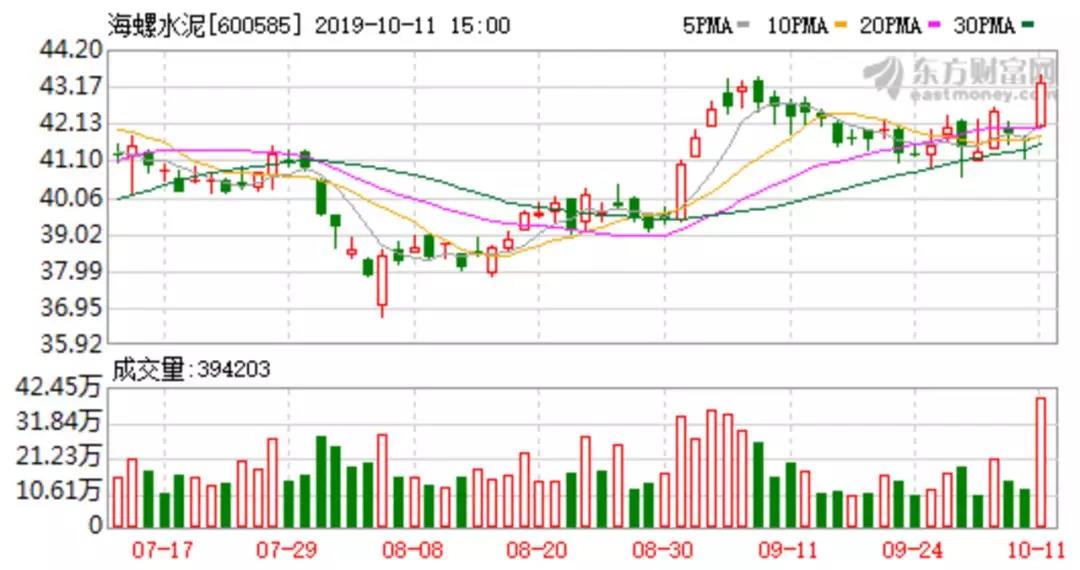 10月11日,海螺水泥盘中最高价43.46元,股价创历史新高。截至收盘,海螺水泥最新价为43.26元,上涨3.79%,全日成交金额达到16.93亿元,换手率0.99%。根据最新收盘价进行计算,海螺水泥总市值为2292.48亿元。