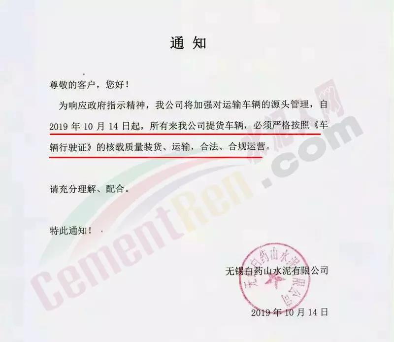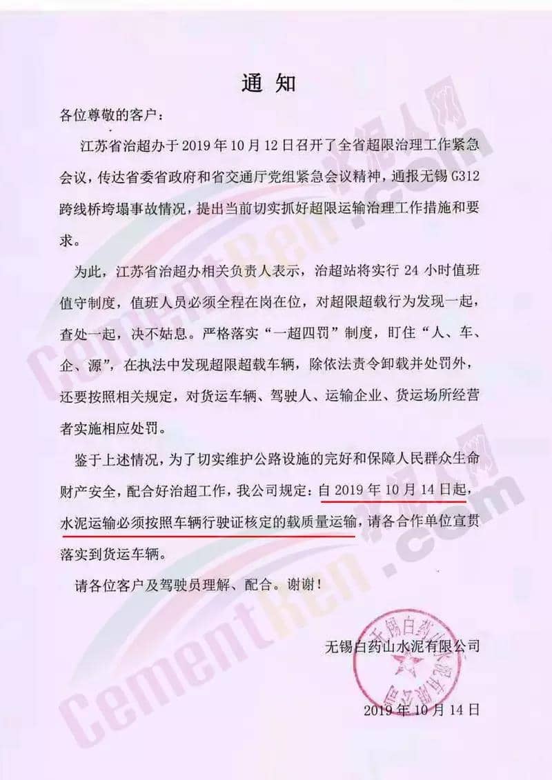 水泥人网消息:近日,多区域启动了针对物流超限的重点整治。日前, 无锡白药山水泥有限公司发布通知称:江苏省治超办相关负责人表示,治超站将实行24小时值班值守制度,值班人员全程在岗在位,对超限超载行为发现一起,查处一起,决不姑息。严格落实“一超四罚”制度,盯住“人、车、企、源”,在执法中发现超限超载车辆,除依法责令卸载并处罚处,还要按照相关规定,对货运车辆、驾驶人、运输企业、货运场所经营者实施相应处罚。鉴于上述情况,为了节实维护公路设施的完好和保障人民群众生命财产安全,配合好治超工作。公司规定自10月14日起,水泥运输车必须按照车辆行驶证核定的载质量运输。并请各合作单位 宣贯落实到货运车辆 。