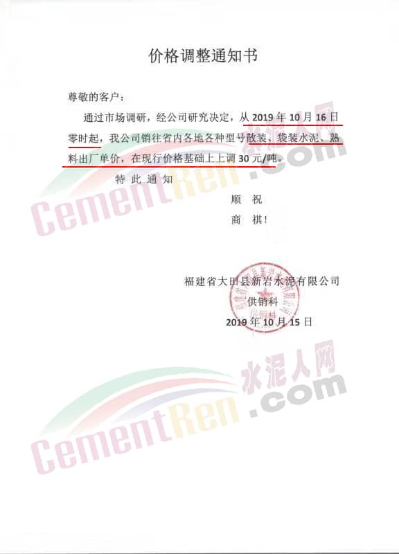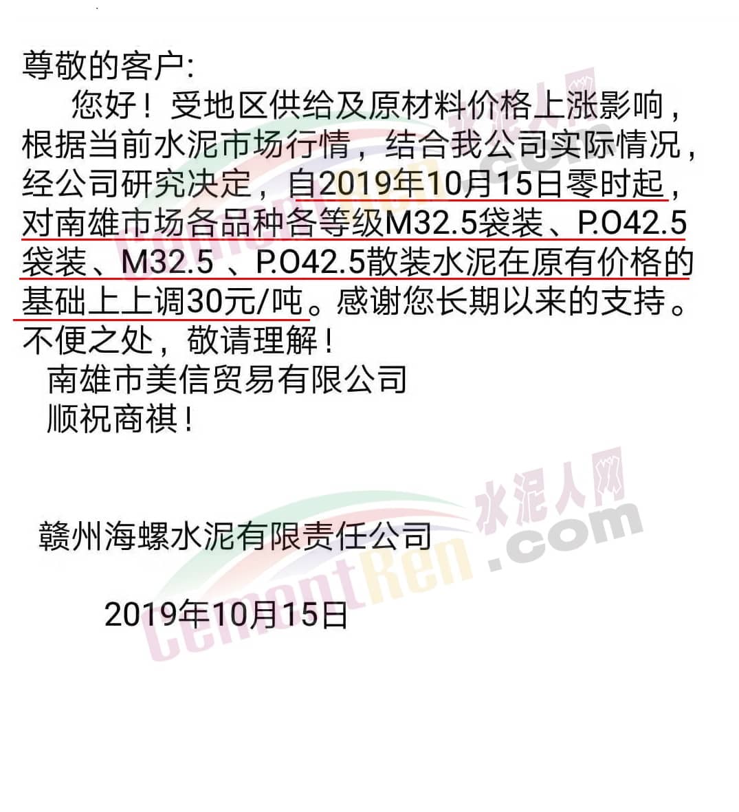 赣州海螺水泥有限责任公司调价通知称,受地区供给及原材料价格上涨影响,根据当前水泥市场行情,结合公司实际情况,经公司研究决定,自10月15日零时起,对南雄市场各品种等级M32.5袋装、P.O42.5袋装、M32.5、P.O42.5散装水泥在原价基础上上调30元/吨。