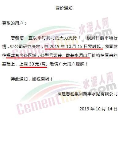 福建春驰集团新丰水泥有限公司通知自15日零时起上调福建省内各区域 ,各型号袋、散装水泥出厂价格,上调