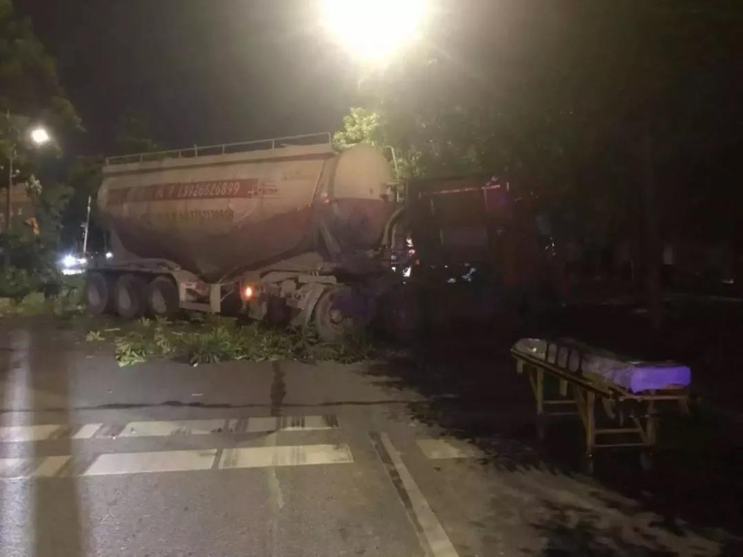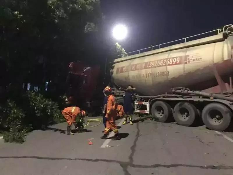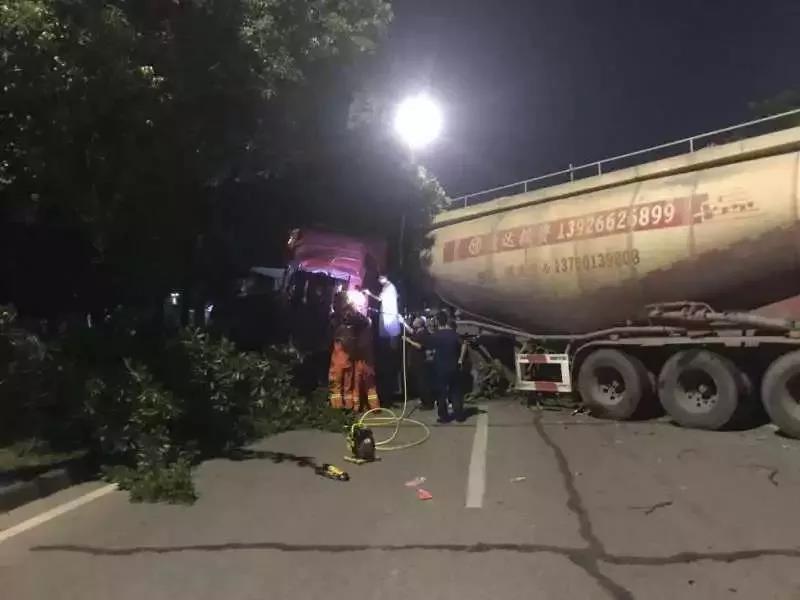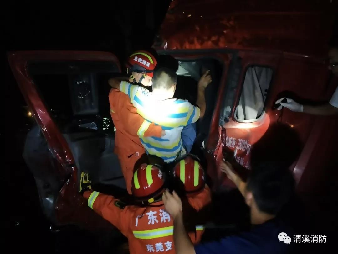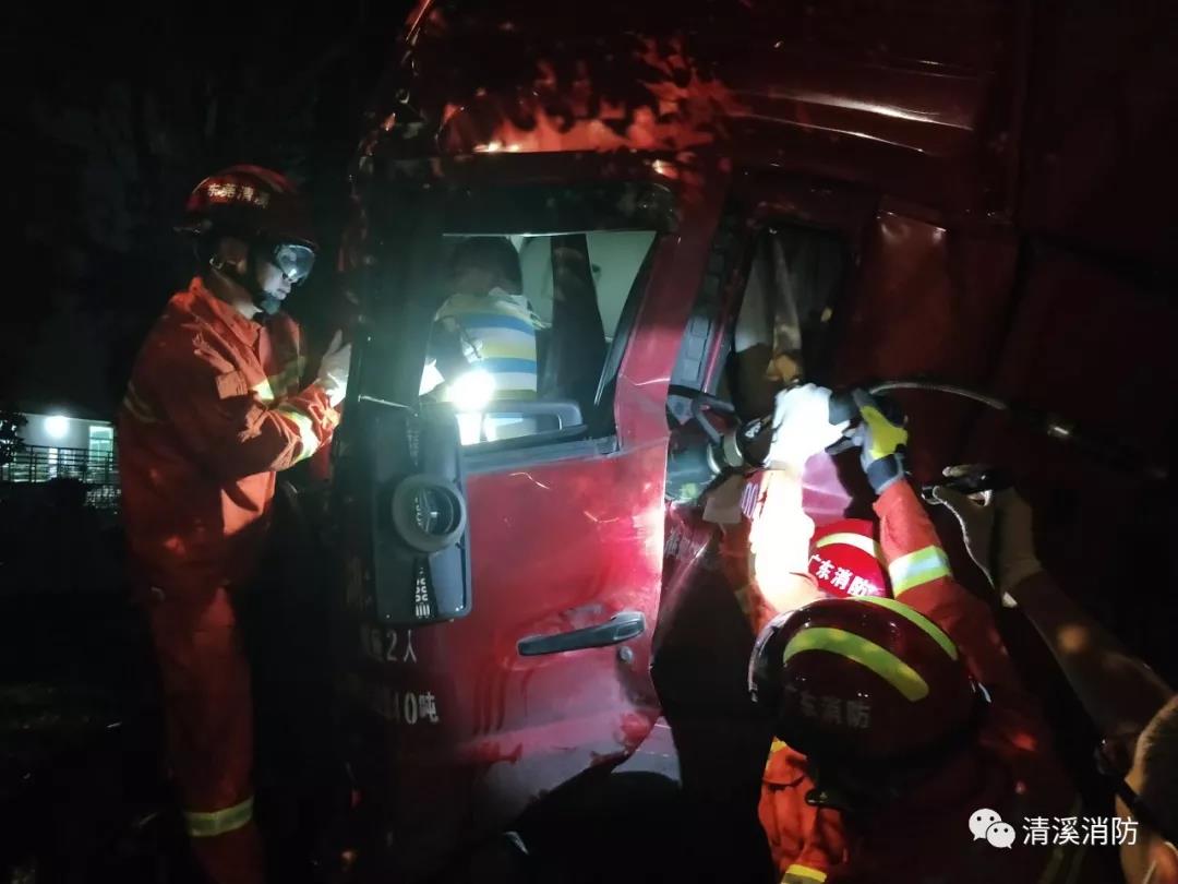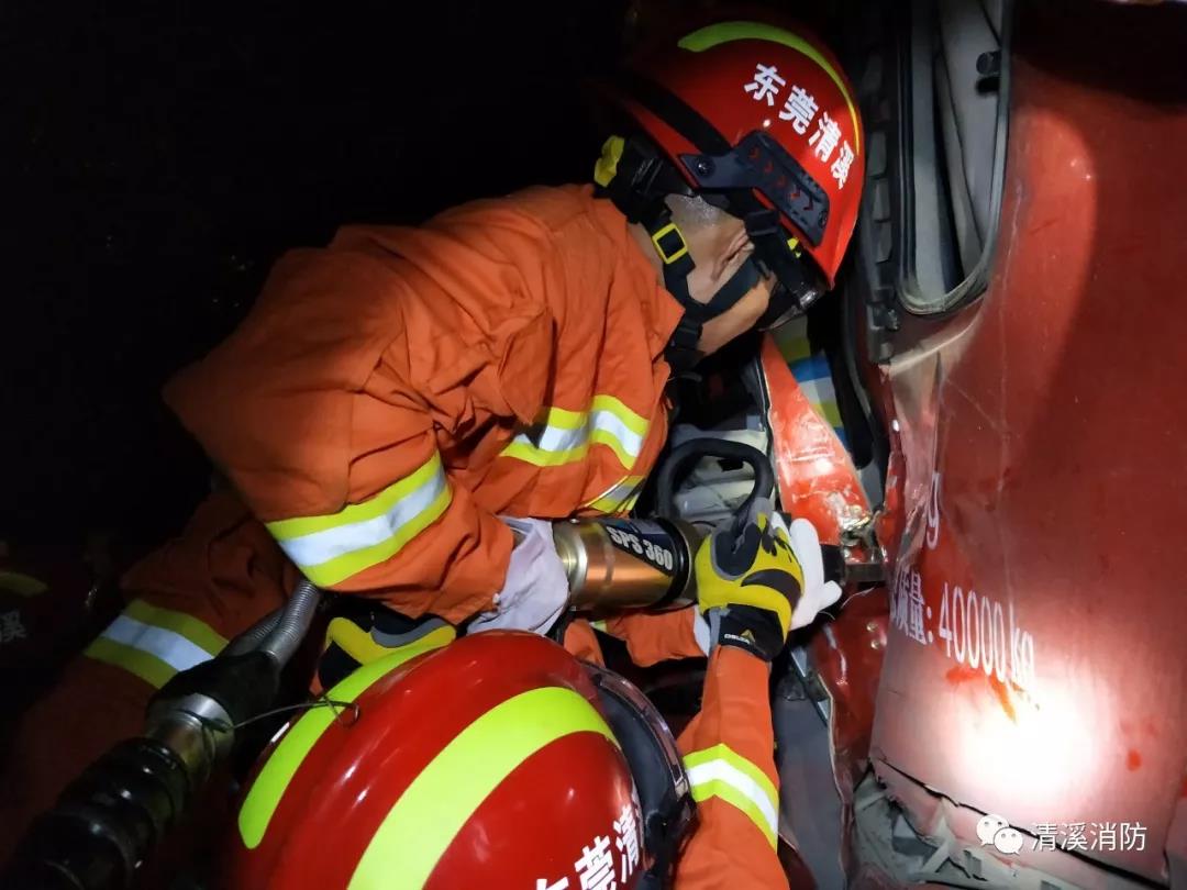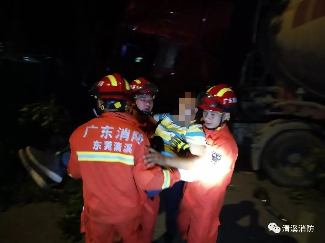 2019年10月15日晚11时41分许,广东东莞市清溪长山头水厂门口一辆水泥车与一辆大货车发生碰撞,水泥车司机被困车内情况紧急。