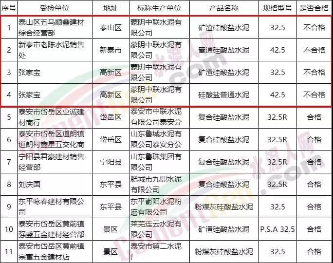 标识生产单位地址均为山东省蒙阴县蒙阴镇东城村;包装袋上标注商标均为蒙阴中联;不合格样品的不合格项目主要有氯离子、烧失量、3天强度、28天强度等。经营者分别是泰山区五马顺鑫建材综合经营部,新泰市老陈水泥销售处,北集坡镇张家宝。通报称,在规定的异议期内,泰安市局未收到经营者、生产者提出的书面的检验结论异议或者复检申请。后期的执法办案过程中,蒙阴中联水泥有限公司向执法部门书面出具了《蒙山中联牌水泥真伪鉴别通知书单》,认为现场水泥不是蒙阴中联水泥有限公司“蒙山中联”品牌水泥。