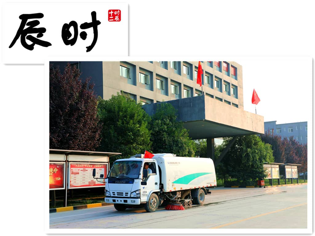 辰时(7:00—9:00)“少刻辰时日正高”。迎着朝阳,洒扫车正奔忙与厂区之中,为美好的一天营造舒适干净的环境。