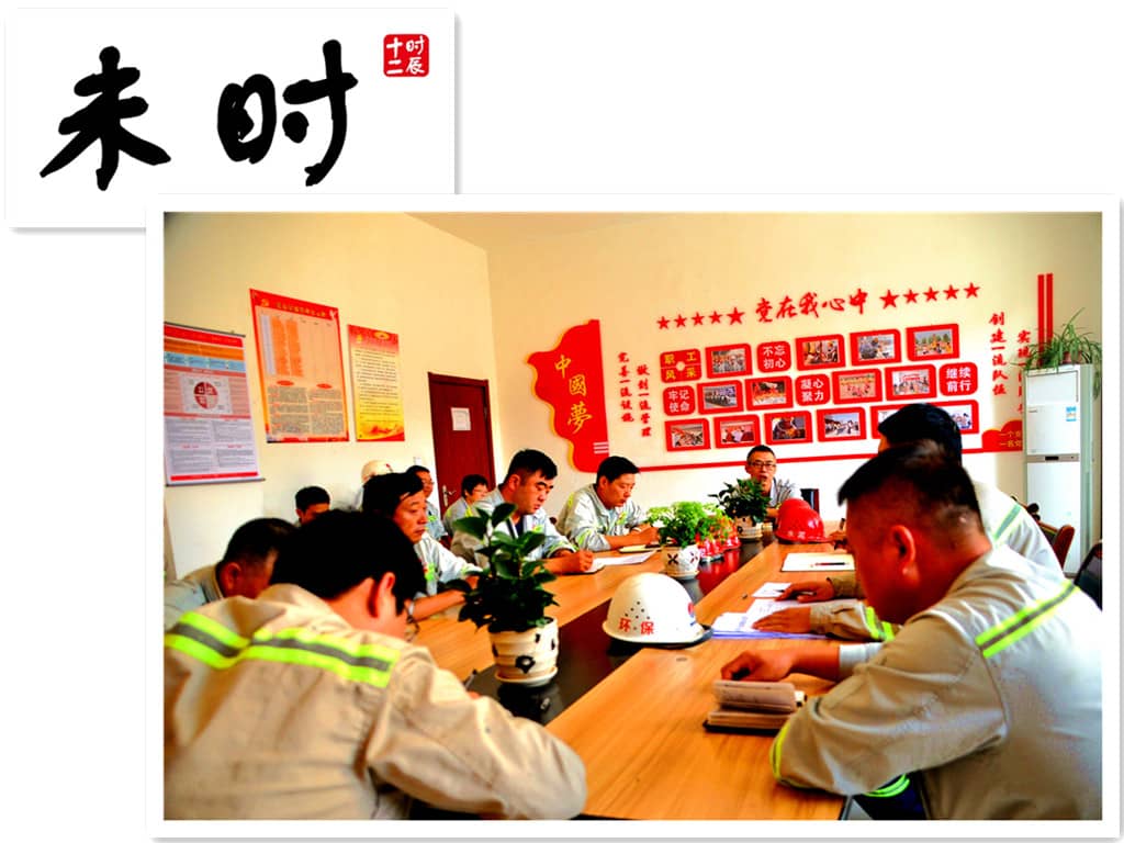 未时(13:00—15:00)“未时红日过街来”。生产设备部正在召开临时会议,齐心协力商讨2#水泥磨的检修计划,及围绕此计划实施的安全生产细则。