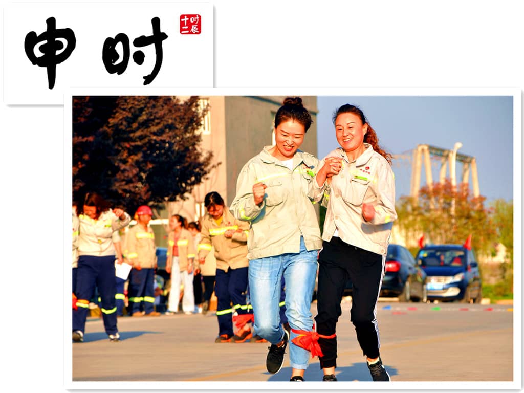 申时(15:00—17:00)办公楼 前举办的职工趣味活动热闹非凡,每个职工的脸上无不洋溢着灿烂的笑容。