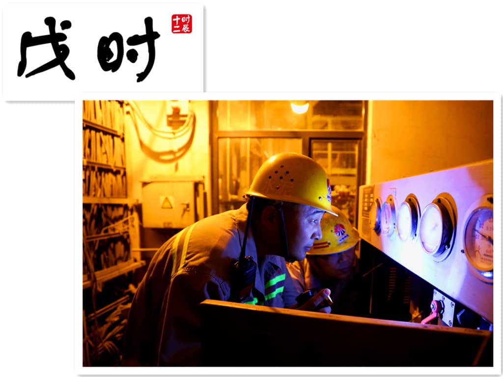 戌时(19:00—21:00)“月上柳梢头,人约黄昏后。”俩名巡检工正“聚精会神”对煤磨液压油站进行巡检。