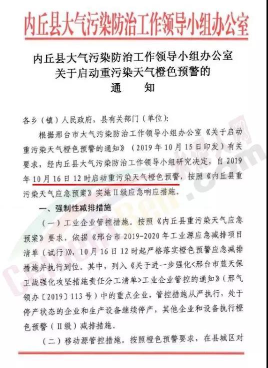 日前,河南省污染防治攻坚战领导小组办公室刚下发《关于启动重污染天气橙色预警的通知》要求 郑州、开封、洛阳、平顶山、安阳、鹤壁、新乡、焦作、濮阳、许昌、商丘、济源 12 市于 10 月 18 日 0 时启动重污染天气橙色预警及Ⅱ级响应,提前应急应对,确保各项管控措施落实到位。