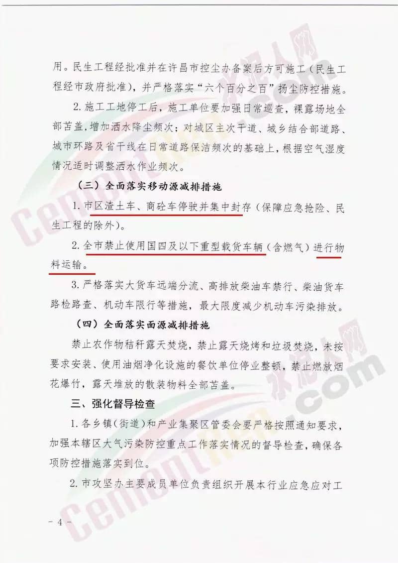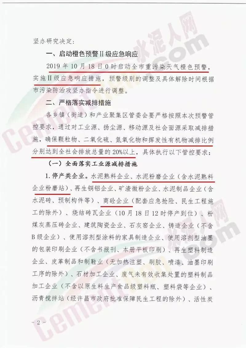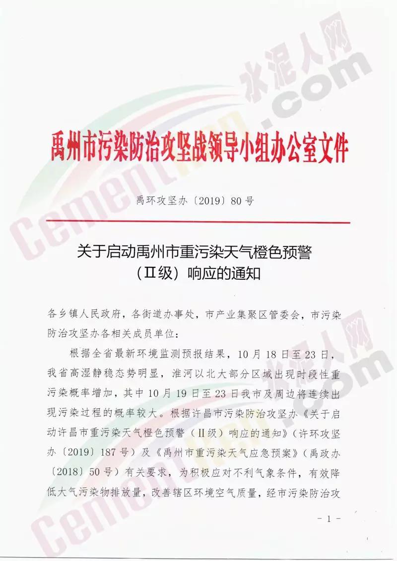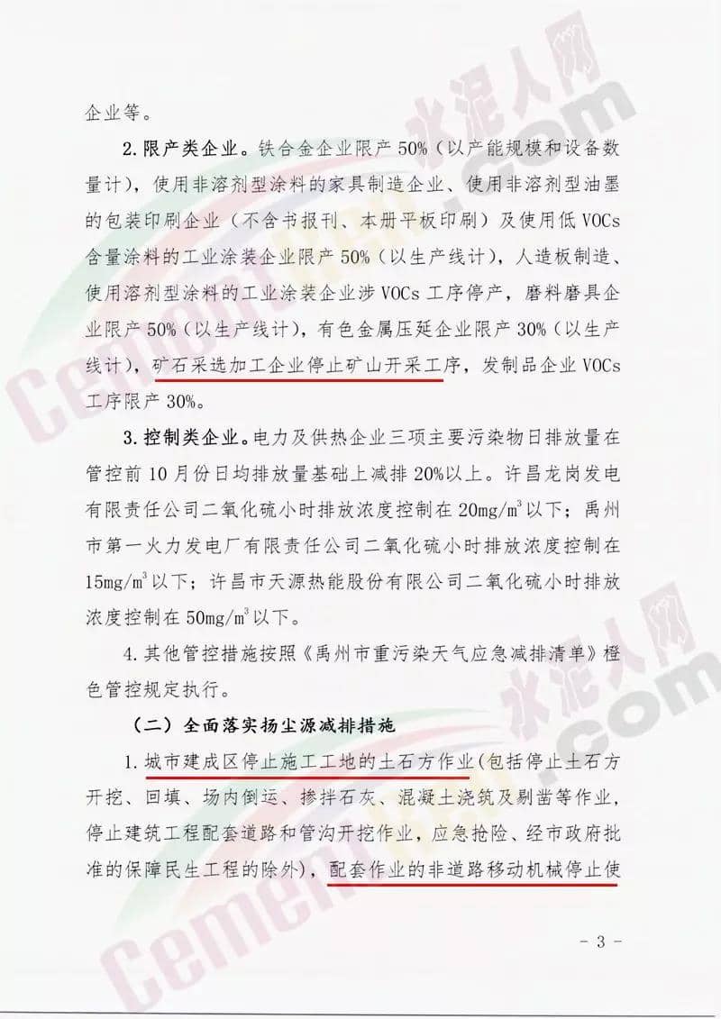 河南禹州自10月18日0时起启动全市重污染天气橙色预警,实施II级应急呼应措施。要求确保颗粒物、二氧化硫、氮氧化物和挥发性有机物减排比例分别达到全社会的20%以上。要求工业企业全面落实工业源减排措施,其中水泥熟料企业、水泥粉磨站企业(含水泥熟料企业粉磨站)、商砼企业等停产;矿石采选加工企业停产矿山开采工序。城市建成区停止施工工地的土石方作业,配套作业的非道路移动机械停止使用。详情如下:
