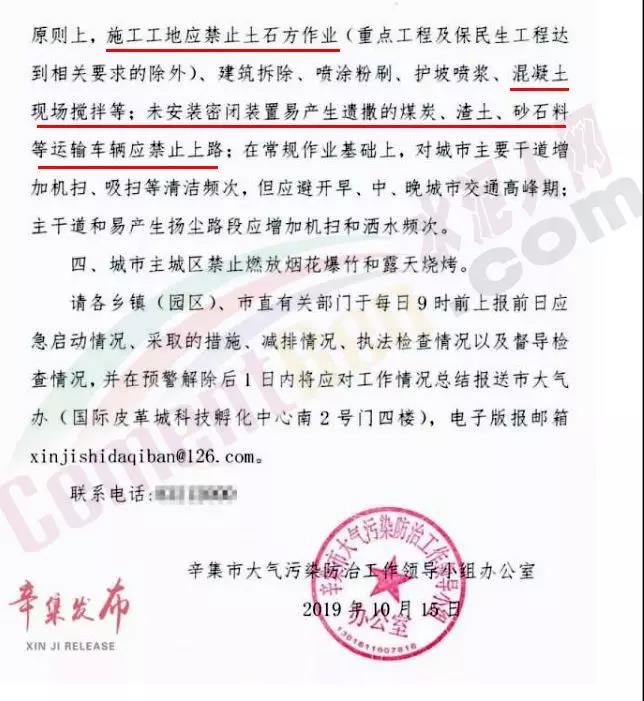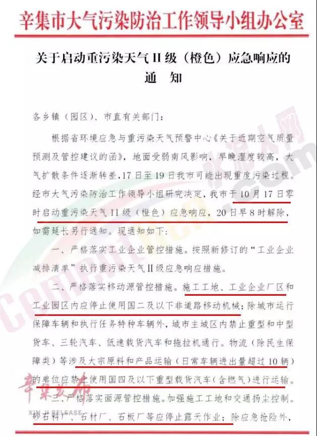 水泥人网消息:昨日(17日)唐山市人民政府再发特提文件《关于进一步加严当前空气质量强化管控措施的通知》称:根据生态环境部、省生态环境厅最新预测,10月18日至22日期间,将连续出现中度至重度污染过程。唐山市政府决定 在重污染天气II级应急响应规定的应急减排措施基础上,采取进一步加严管控措施:10月18日8时至10月22日8时,港口集疏运车国内禁止进出港区;全市钢铁、焦化、水泥等企业禁止重型货车进出厂区;施工工地和企业停止使用非道路移动机械。10月18日0时至10月22日8时,路南、路北、高新、开平境内的施工工地停止施工。原文件如下: