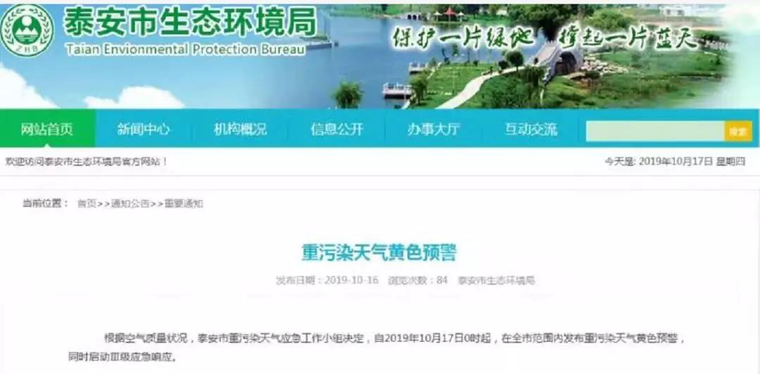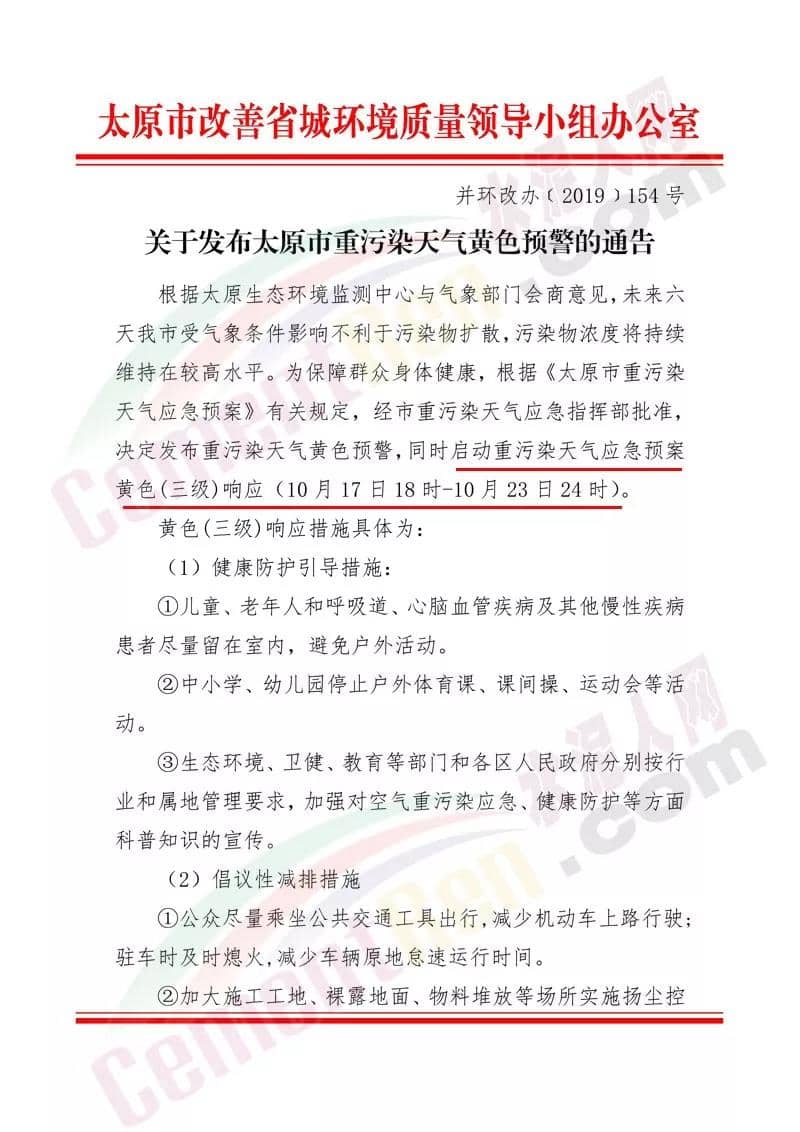 太原市改善省城环境质量领导小组办公室发布《关于发布太原市重污染天气黄色预警的通告》称,自10月17日18时至10月23日24时启动重污染天气应急预案黄色(三级)响应。