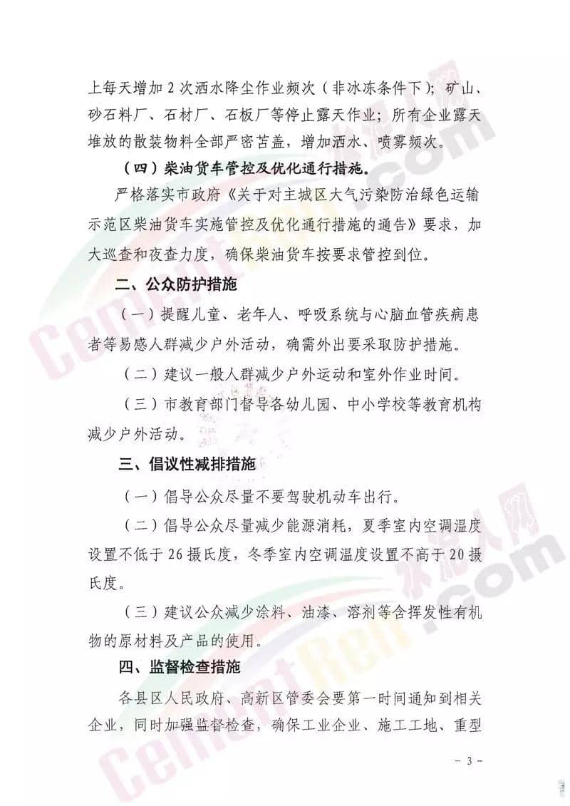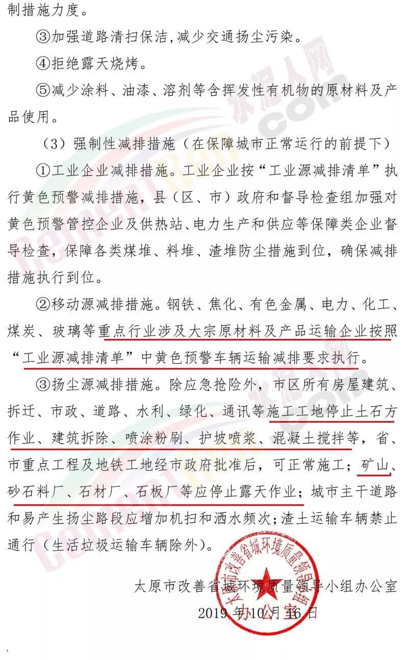 要求重点行业涉及大宗原材料及产品运输企业按照“工业减排清单”中黄色预警车辆运输减排要求执行。同时要求施工工地停止土石方作业、建筑拆除、混凝土搅拌等;矿山、砂石料 厂、石材厂、石板厂等停止露天作业等。