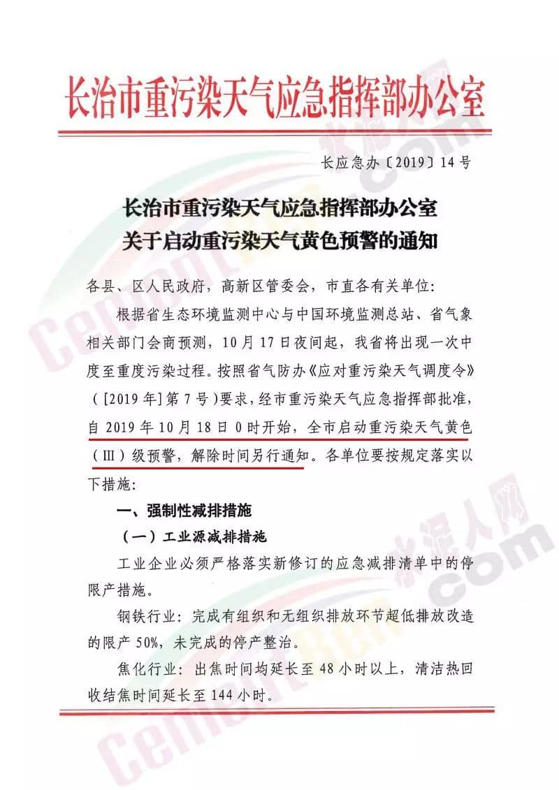 山西长治市重污染天气应急指挥部办公室发布《关于启动重污染天气黄色预警的通知》称将自今日(18)0时开始,全市启动重污染天气黄色(III)级预警,解除时间另行通知。预警管控期间,水泥、建材、采石采砂等行业全部停产。详情如下: