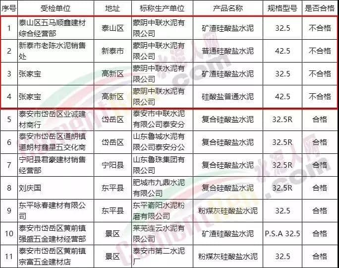 山东泰安4批次样品不合格,抽样合格率为63.6%据通报,泰安市市场监管局于2019年8月至10月在全市范围内组织开展了第一批流通领域水泥商品质量监督抽查。本次共监督抽查10家经营部,抽取11批次样品。其中检出4批次样品不合格,本次水泥商品抽样合格率为63.6%。4个批次不合格水泥基本情况:2批次矿渣硅酸盐水泥和2批次普通硅酸盐水泥;标称生产单位均为蒙阴中联水泥有限公司;标识生产单位地址均为山东省蒙阴县蒙阴镇东城村;包装袋上标注商标均为蒙阴中联;不合格样品的不合格项目主要有氯离子、烧失量、3天强度、28天强度等。经营者分别是泰山区五马顺鑫建材综合经营部,新泰市老陈水泥销售处,北集坡镇张家宝。泰安市2019年度流通领域水泥商品质量第一批专项监督抽查结果总汇表