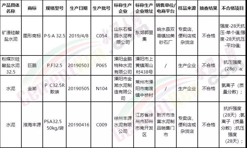 山东淄博1批次水泥不合格山东省淄博市市场监督管理局公布的水泥产品质量市监督抽查结果显示2019年4月至6月,淄博市市场监督管理局组织开展了水泥产品质量市监督抽查。本次共抽查了全市32家企业生产的32批次水泥产品,其中淄博黉阳水泥厂(有限公司)生产的P.S.A32.5矿渣硅酸盐水泥(生产日期/批号为2019-3-25/P603)抽检不合格,不合格项目为“氯离子”