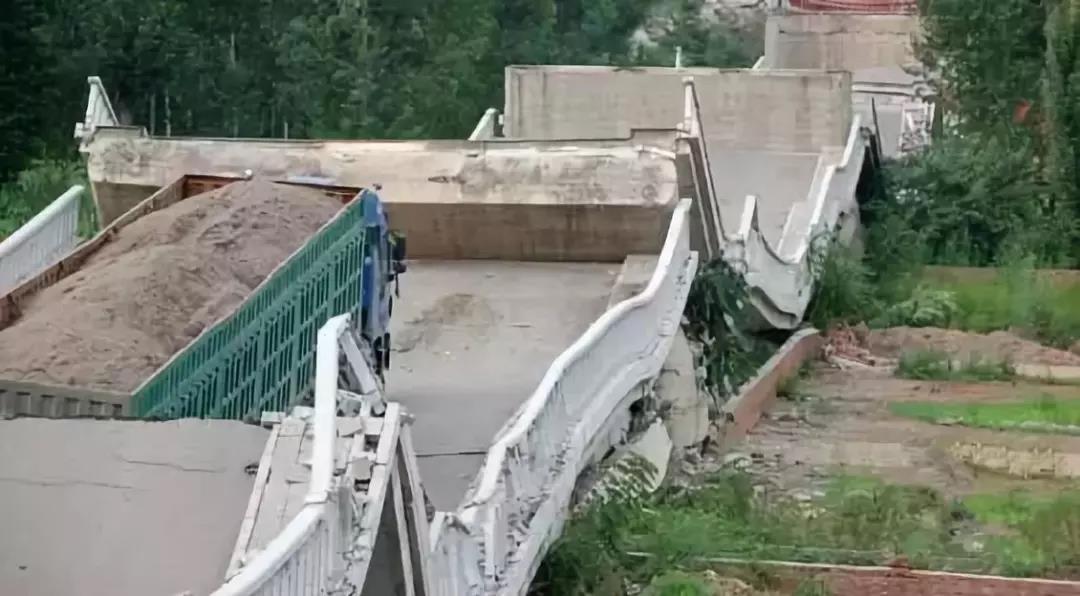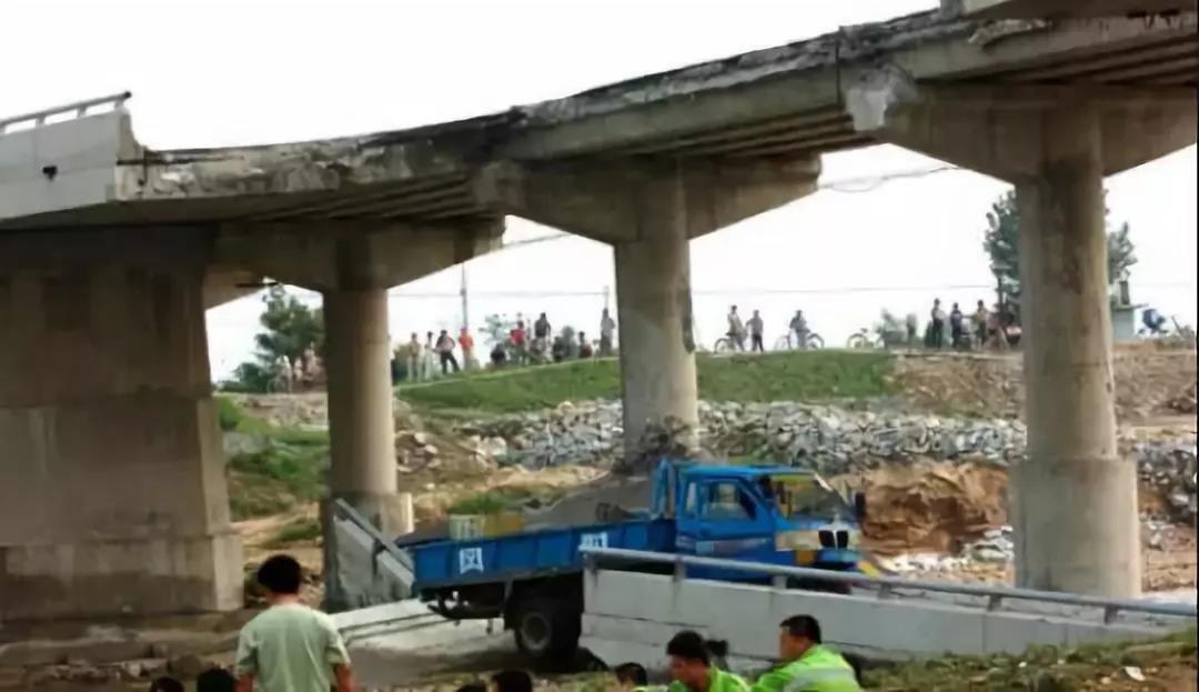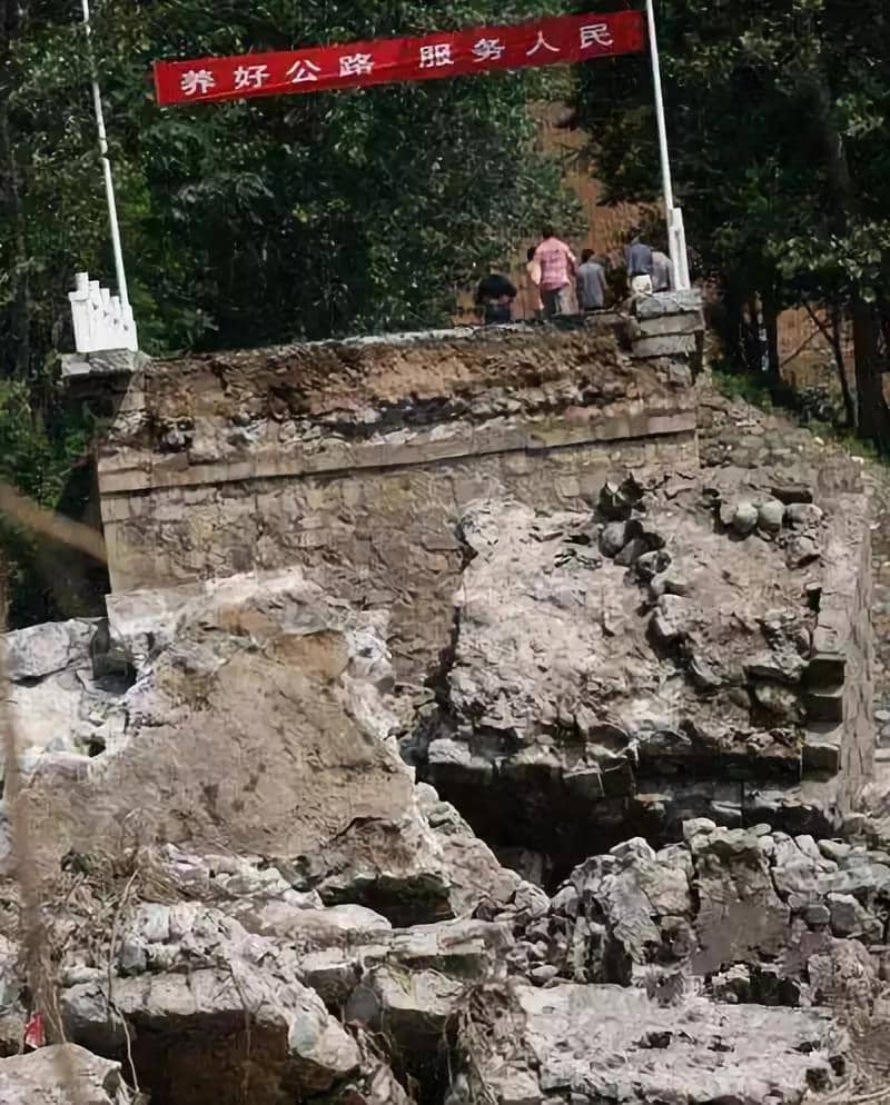 伊河汤营大桥整体垮塌。桥上挂的横幅是何等讽刺啊?