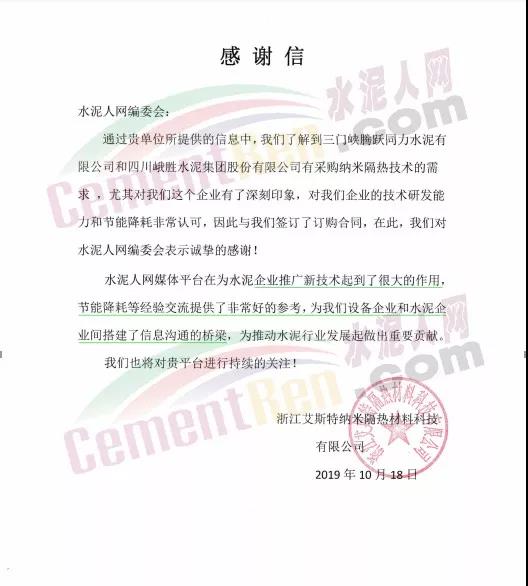 近日,水泥人网收到来自浙江艾斯特纳米隔热材料科技有限公司的一封《感谢信》,为艾斯特纳米隔热材料科技设备企业和水泥企业间搭建了信息沟通的桥梁。 江艾斯特纳米隔热材料科技有限公司表示:水泥人网为水泥企业推广新技术起到了很大的作用,节能降耗等经验交流提供了非常好的参考,为推动水泥行业发展起到了重大贡献。 水泥人网作为水泥行业最大的新媒体平台,一直在不断的推动行业发展,为水泥行业竖品牌,为企业办事的宗旨,致力于服务水泥行业上下游企业,为水泥行业贡献自己的一番力量。