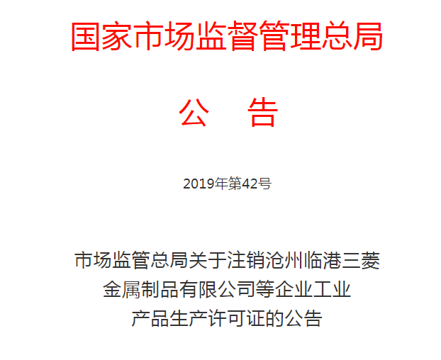 水泥人网消息:日前,国家市场监管总局发布《关于注销沧州临港三菱金属制品有限公司等企业工业产品生产许可证的公告》称:根据《中华人民共和国工业产品生产许可证管理条例》(国务院令第440号)、《中华人民共和国工业产品生产许可证管理条例实施办法》(质检总局令第156号),因生产许可证有效期届满未延续等情形,决定注销沧州临港三菱金属制品有限公司等603家企业的工业产品生产许可证,并将名单予以公布。
