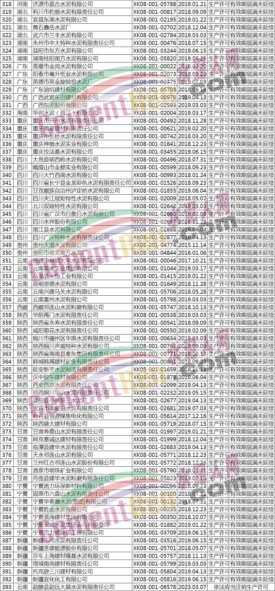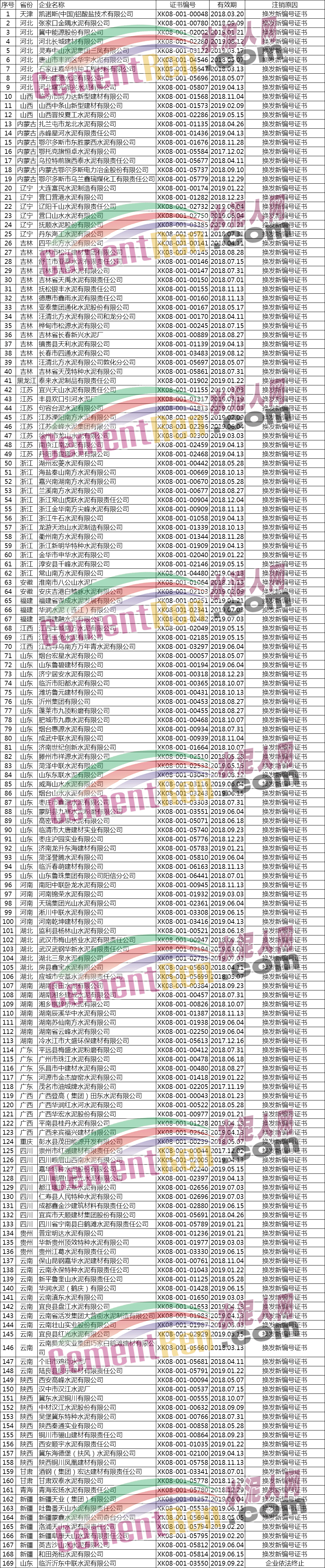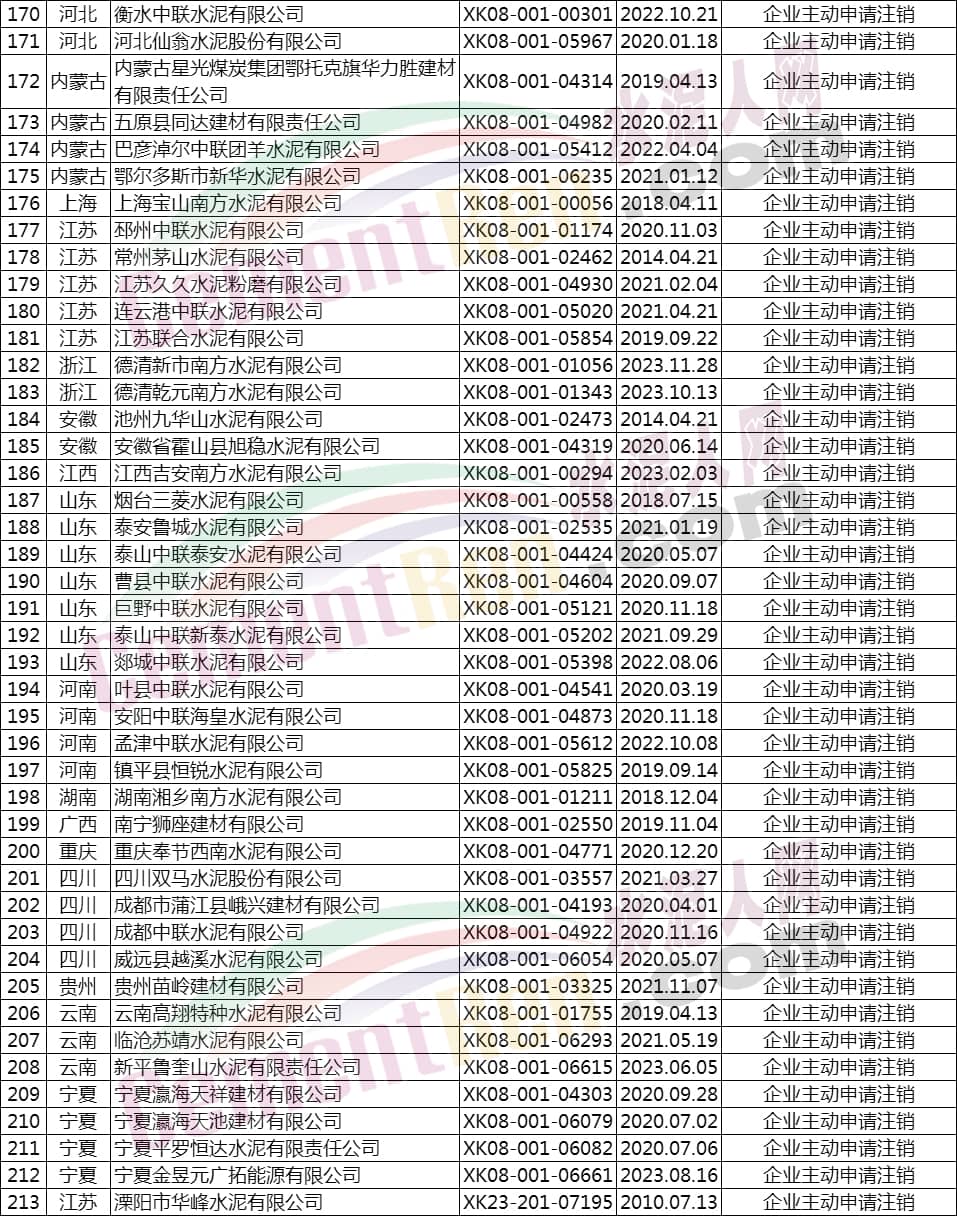 据水泥人网了解,公告注销工业产品生产许可证的603家企业中包括393家水泥企业。其注销原因为,换发新编号证书、企业主动申请注销、生产许可有效期届满未延续等,详情如下: