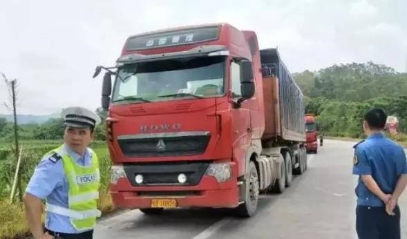 阳江市交通、公安交警执法人员在海螺水泥厂路段联合开展治超突击行动