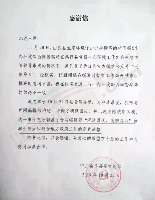 同时,西藏自治区桑日县委宣传部对于水泥人网积极配合地方政府工作给予了高度的肯定,并称“这一事件充分彰显了水泥人网的‘澄清谬误、明辨是非’的职业担当和配合地方政府工作的高贵品格”,这是对于水泥人网日常工的充分肯定和最高褒奖。