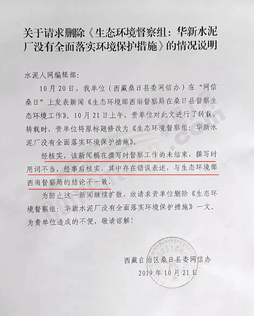 次日(21日),西藏自治区桑日县委网信办致函水泥人网,将相关情况做澄清说明,并请求删除《生态环境督查组:华新水泥厂没有全面落实环境保护措施》一文。桑日县委网信办情况说明称:该新闻稿在撰写时监督工作尚未结束,撰写时用词不当,经事后核查,其中存在错误表述,与生态环境部西南督查查局的结论不一致。为了防止这一错误消息继续扩散,故而请求水泥人网编辑部删除微信公众平台相关消息。